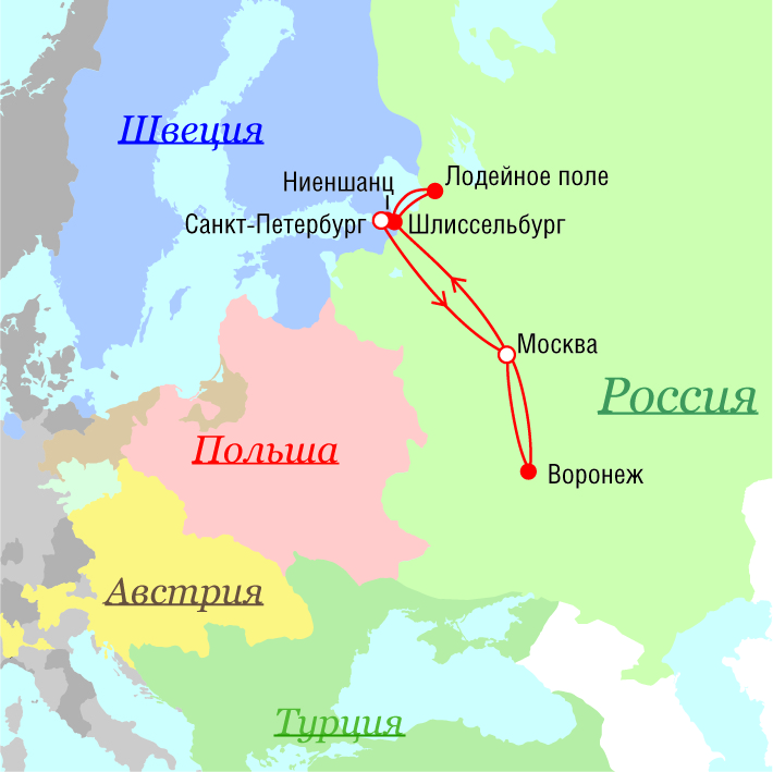 На карте указаны маршруты путешествий Петра I на каждый год. Расстояния приблизительно вычислены по российским дорожникам XVIII и XIX вв. Различия в длине маршрутов Петра и современного пути объясняются другой сеткой дорог. Длина маршрутов, на которые данные дорожников отсутствуют, была определена по электронным картам.