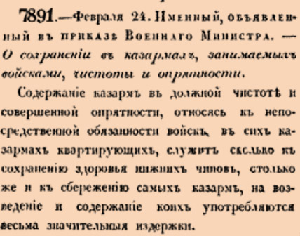 Закон № 7891. 1835 год. 24 февраля (8 марта). Именной указ об обязательности поддержания санитарного порядка в воинских казармах и установлении персональной ответственности командного состава и смотрителей зданий.