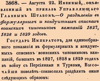 3868. 1830 год. 22 августа (3 сентября). Именный, объявленный в приказе Управляющаго Главным Штабом. О разделении в формулярных и кондуитных списках воинских чиновников кампаний 1827, 1828 и 1829 годов.