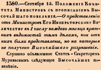 1380. 1827 год. 15 сентября (27 сентября). Положение Комитета Министров с прописанием Высочайшаго повеления. О представлении от Министров Его Императорскому Величеству к 1 числу каждаго месяца кратких ведомостей тем делам, кои от них были представле...
