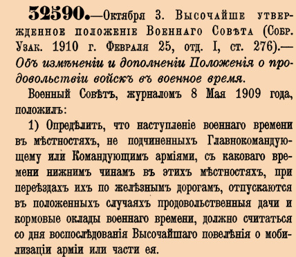 32590. 1909 год (16 октября (3 октября ст.ст.) Высочайше утвержденное положение Военнаго Совета. Об изменении и дополнении Положения о продовольствии войск в военное время.Военный Совет, журналом 8 Мая 1909 года, положил:1)Определить, что наступление военнаго времени в местностях, не подчиненных Главнокомандующему или Командующим армиями, с каковаго времени нижним чинам в этих местностях, при переездах их по железным дорогам, отпускаются в положенных случаях продовольственныя дачи и кормовые оклады военнаго времени, должно считаться со дня воспоследования Высочайшаго повеления о мобилизации армии или части ея