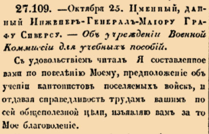 Закон № 27.109 — 1817 год 6 ноября (25 октября). Указ об учреждении Военной комиссии для создания учебных пособий для кантонистов.