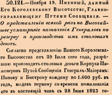 30121. 1824 год. 1 декабря (19 ноября ст.ст.). Именный, данный Его Королевскому Высочеству, Главноуправляющему Путями Сообщения. О представлении всякой раз на Высочайшее усмотрение назначения Генералов по резерву и производства им столовых денег. Согласно представлению Вашего Королевскаго Высочества от 29 Июля сего года, разрешаю производить столовыя деньги Корпуса Инженеров Путей Сообщения Генерал-Майорам: Попову и Бистрому каждому по 1600 рублей <…>