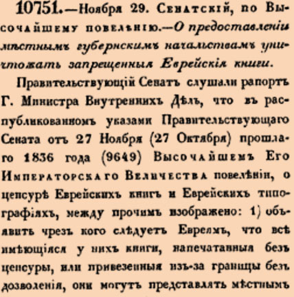 10751. 1837 год. 11 декабря (29 ноября ст.ст.) Сенатский, по Высочайшему повелению. О предоставлении местным губернским начальствам уничтожать запрещенныя Еврейския книги.<…> 1) объявить чрез кого следует Евреям, что все имеющиеся у них книги, напечатанныя без ценсуры, или привезенныя из-за границы без дозволения, они могут представлять местным начальствам в течении года, не опасаясь за то наказания, но что по прошествии сего срока, с теми из них, у которых такия книги окажутся, поступлено будет по всей строгости законов <…>