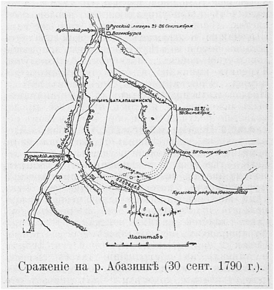 27 сент. разъезды дали знать, что неприятель взял направление к Каменному Броду (15 вер. к ю. от Баталпаш.), имея намерение обойти нас с ю.; в виду чего Герман отодвинулся на 15 вер. от первонач. расположения к р. Подбаклее, впадающей в Кубань ниже А.; этим маневром прикрывались отчасти пути в Кабарду. 28 сент. турки переправились через Кубань у Кам. Брода и стали здесь укрепл. лагерем. Высоты же, лежавшия перед последним, не были заняты противником и ими в ту же ночь овладел отр. Германа, решившаго здесь дожидаться присоединения Булгакова. Но, несмотря на занятую отр. Германа фланговую позицию, турки, уже к вечеру 28 сент., начали наступление в направлении к Кумскому редуту, — узлу дорог в Кабарду и Георгиевск (гл. город наших влад. на Кавказе). Сознавая опасность такого маневра, ген. Герман решил атаковать турок, не ожидая присоединения Булгакова. Для чего в 6 ч. утра, из лагеря на р. Подбаклее, был выслан авангард под нач. маиора кн. Орбелиани, которому приказано занять командующия высоты над прав. берегом А.; турки тоже стремились их занять; но авангард наш, поддержанный всей кавалерией, успел на них утвердиться…