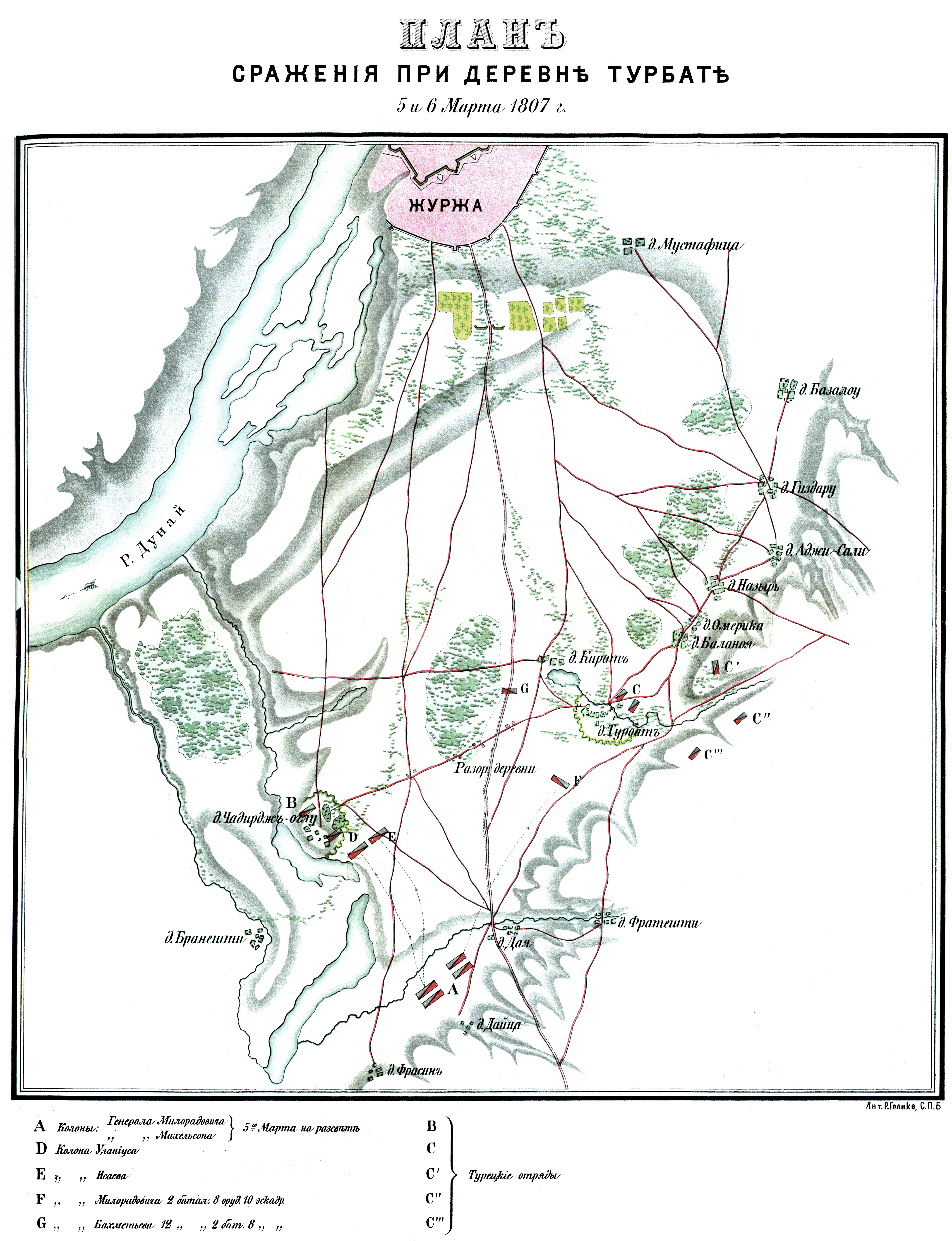5-го марта, на рассвете, обе колонны, не доходя одной версты до позиции турок, остановились на левом берегу небольшого ручья между деревнями Дая и Фрасине. После двухчасового отдыха генерал Михельсон направил войска свои на неприятельскую позицию. Турки, в числе 8000 человек, занимали деревни, укрепленные окопами,—Чаторжоглу и Турбат. Деревни эти расположены были на равнине, в трех верстах впереди крепости Журжево: Чаторжоглу упиралась в небольшое озеро, а Турбат примыкала к высотам, огибавшим равнину; расстояние между ними было небольшое,—около 2-х верст. На Чаторжоглу, под общим начальством генерала Шевича, двинулись две колонны: генерал-майоров Исаева и Уланиуса. На Турбат генерал Милорадович повел два батальона Ашперонского и Орловского пехотных полков, при 8 орудиях, и 10 эскадронах кавалерии. Между Шевичем и Милорадовичем, по прямой, из деревни Дая, дороге к Журжево, генерал Бахметьев вел 2 батальона и 8 эскадронов, при 12-ти батарейных орудиях…
