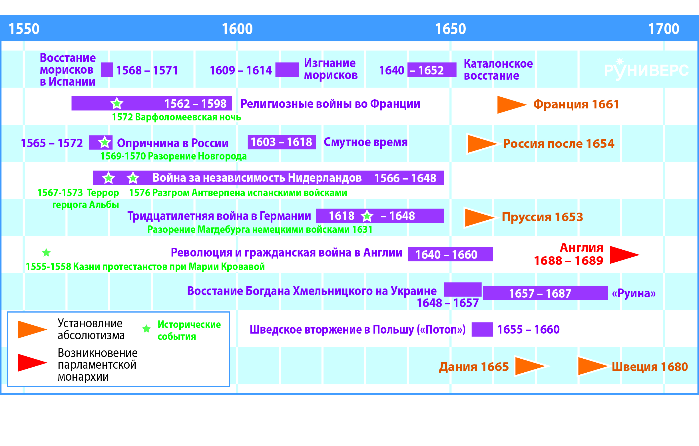 1560-е годы как раз были переломными для Европы. В любом академическом учебнике истории говорится о том, что период 1560–1660 годов — это период смут, гражданских и религиозных войн в Европе, то есть по не вполне понятным причинам в середине XVI века в этой части света начинается полоса небывалых по ожесточённости внутренних конфликтов. Примечательно, что этот процесс инициируется с двух сторон континента: с одной стороны — Франция, где в 1562 году начинаются религиозные войны (длились 36 лет, до 1598-го), чуть позже (в 1566-м) они начались в Нидерландах, с другой стороны — Россия, где появляется опричнина (1565). Продолжая этот ряд событий, следует отметить 1567 год — свержение королевы Марии Стюарт в Шотландии и её заключение в Англии после бегства, завершившееся беспрецедентной казнью в 1587 году (послужившей, в свою очередь, прецедентом для будущих казней короля Англии Карла I в 1649-м и короля Франции Людовика XVI в 1793-м).