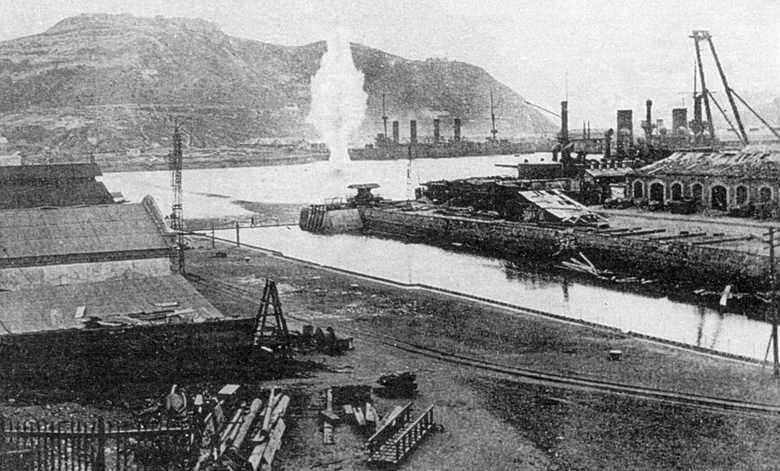 На первом плане, под стрелой плавкрана - эскадренный броненосец "Севастополь". На заднем плане - броненосный крейсер "Баян". В бухте - всплеск от падения 280-мм снаряда осадной гаубицы