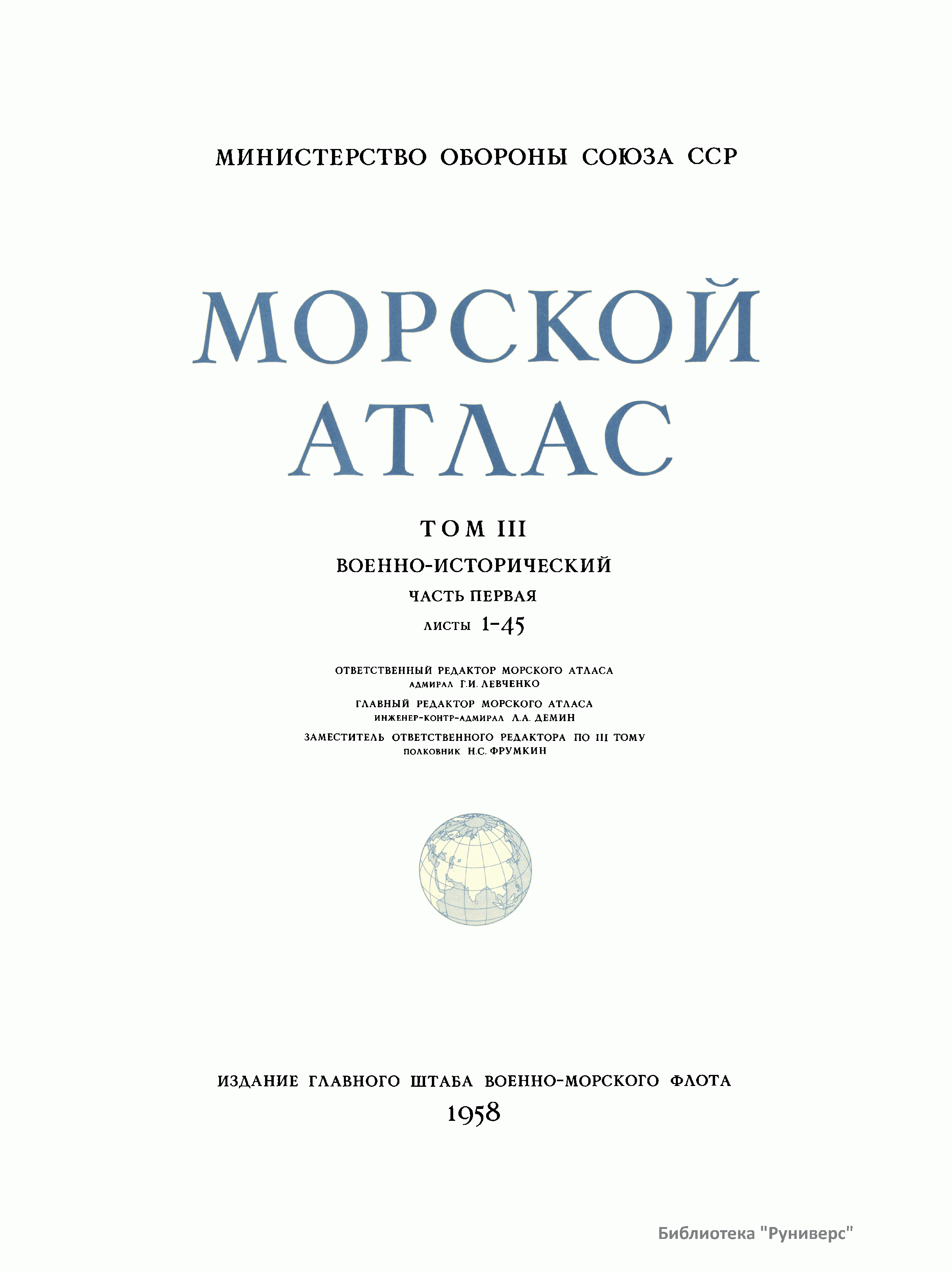 Морской атлас издается Главным штабом Военно-Морского Флота по постановлению Совета Министров Союза ССР.