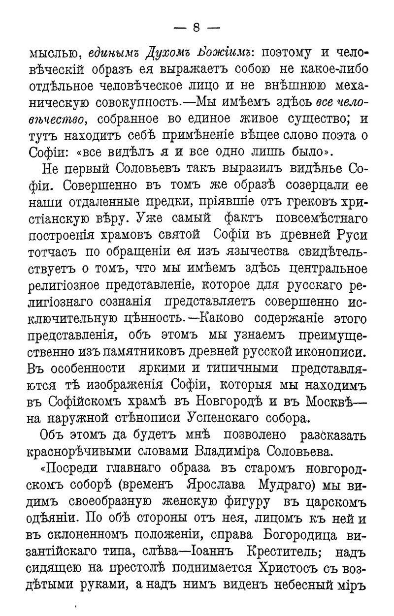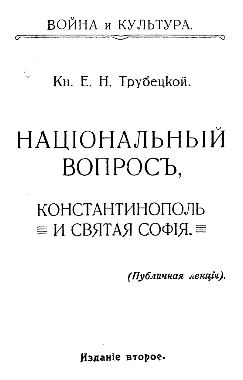 В работе «Национальный вопрос, Константинополь и Святая София» кн. Е. Н. Трубецкой стремится осмыслить события Первой мировой войны в свете софийной метафизики