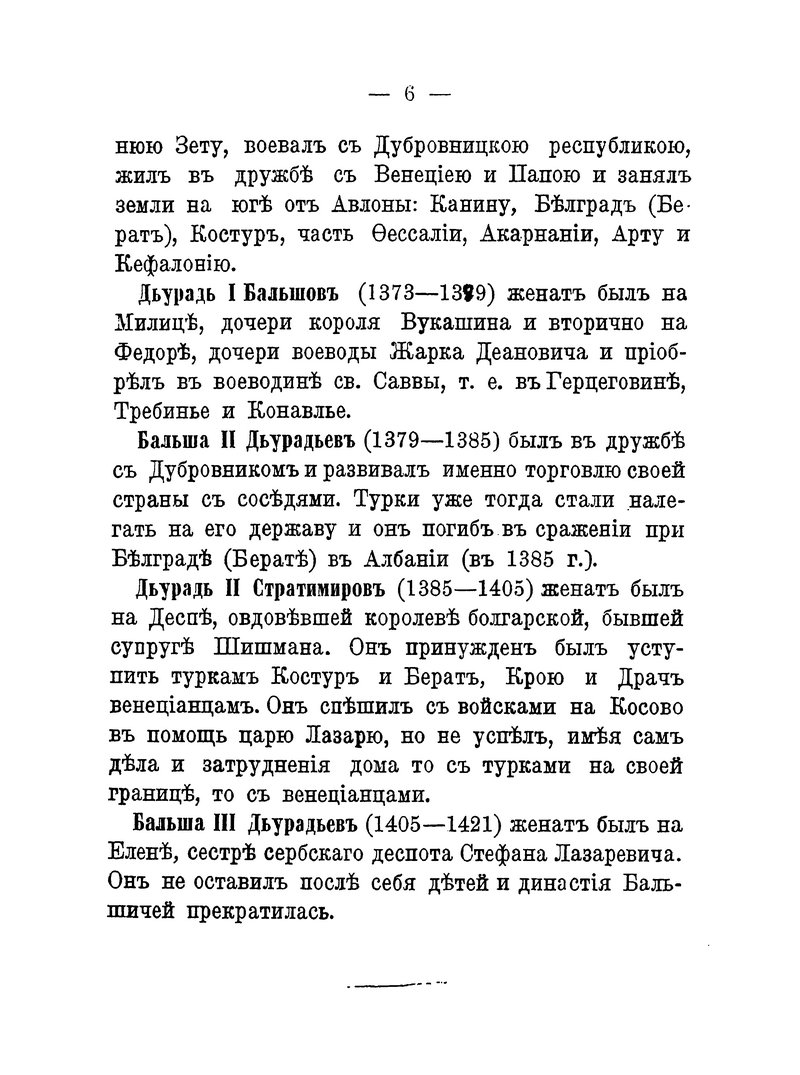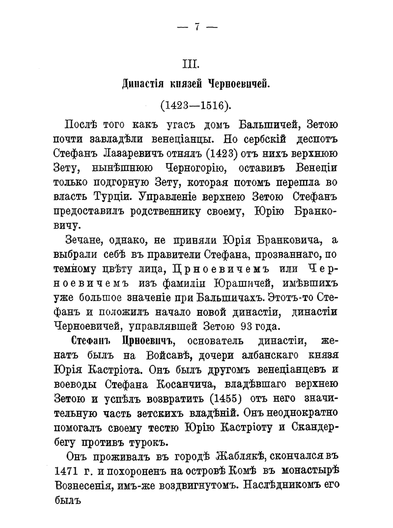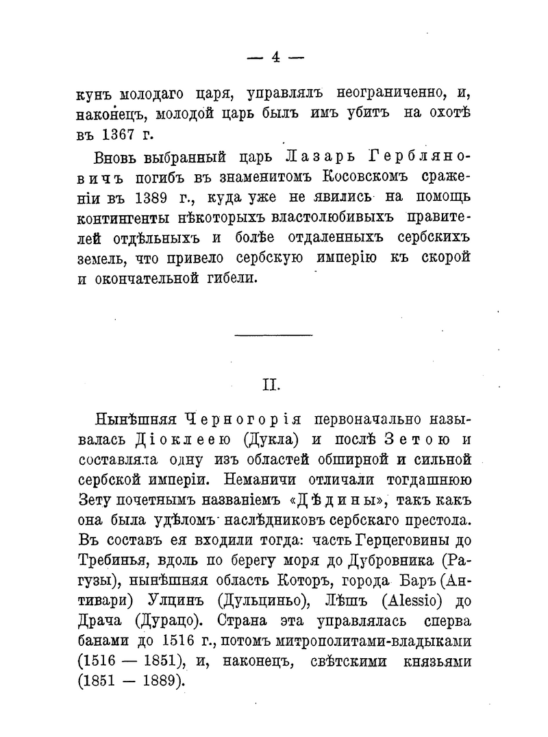 Черногорский народ и его династии с древнейших времён выделялись в общей сербской истории. В книге содержатся краткие сведения о династии Бальшичей (1356 – 1421); династии князей Черноевичей (1423 – 1516); о Черногории, управляемой владыками-митрополитами (1499 – 1695); о царствующей династии Петровичей-Негошей (1697 – 1851); о Черногории под властью светских князей из дома Петровичей-Негошей (с 1851).