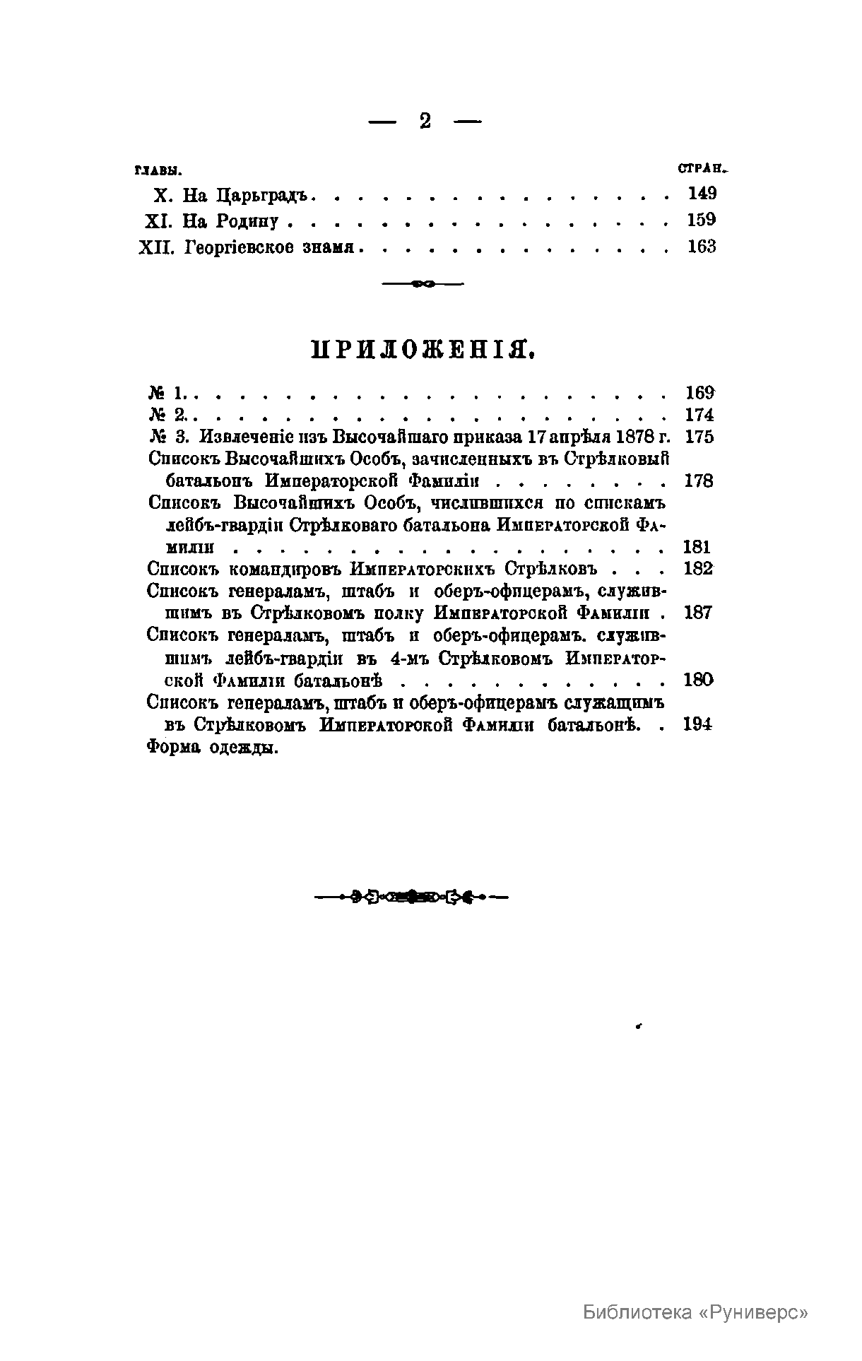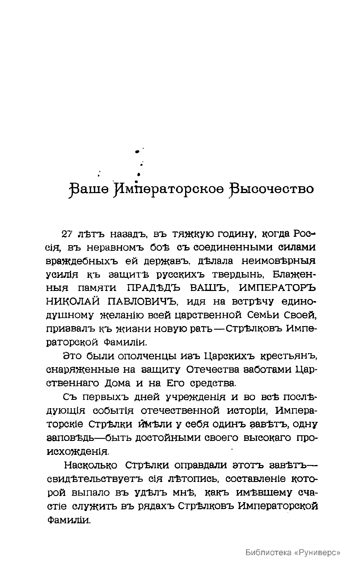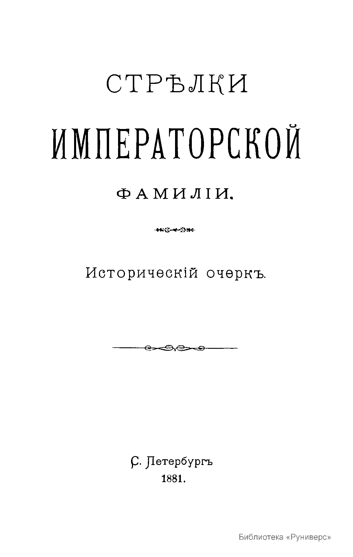 Исторический очерк, представляющий краткое популярное описание основных этапов создания и развития Лейб-гвардии стрелкового императорской фамилии полка и батальона принадлежит перу видного общественного деятеля последних трех царствований генералу Евгению Васильевичу Богдановичу, который долгие годы, вплоть до своей кончины, состоял почетным членом в этой элитной части. Инициатором создания этой уникальной по статусу воинской части, которая должна была стать образцом для всей российской армии, выступил сам император Николай I. Незадолго до своей смерти, 25 октября 1854 года, в начале Крымской войны, он повелел сформировать на время военных действий из числа крестьян призывных возрастов императорских уделов Стрелковый полк Императорской Фамилии. Менее чем через год полк был сформирован, затем был причислен к гвардейскому корпусу на правах молодой гвардии, а 1 октября 1856 года на мирное время он был уже расформирован. Офицеры и нижние чины поступили на формирование лейб-гвардии стрелкового Императорской Фамилии батальона, который был расквартирован в Гатчине. Само название батальона предполагало зачисление в списки батальона всех великих князей. В гатчинский период существования батальона в его списки были действительно зачислены почти все члены императорского дома. В дальнейшем в августе 1870 года батальон был отчислен в состав вновь сформированной Гвардейской стрелковой бригады под командованием великого князя Владимира Александровича, а через год был переименован в лейб-гвардии 4-й стрелковый Императорской Фамилии батальон. В период русско-турецкой войны 1877-1878 гг. личный состав батальона участвовал в боевых действиях, получив в награду георгиевское знамя «За отличие в Турецкую войну». Краткий очерк этой придворной воинской части, написанный Богдановичем в традиционном для него верноподданническом духе, освещает основные вехи её истории. В приложения к основному тексту автор приводит подробнейшие списки почетных членов батальона, а также списочный состав всех офицеров, проходивших службу в этой части.
