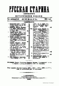 «Русская старина», ежемесячный исторический журнал, выходил в Петербурге в 1870-1918. Основан, издавался и редактировался (1870-1892) М. И. Семевским при участии В. И. Семевского. Последующими редакторами были Н. К. Шильдер (1892-1896), Н. Ф. Дубровин (1896-1904), военные историки С. П. Зыков, П. Н. Воронов.