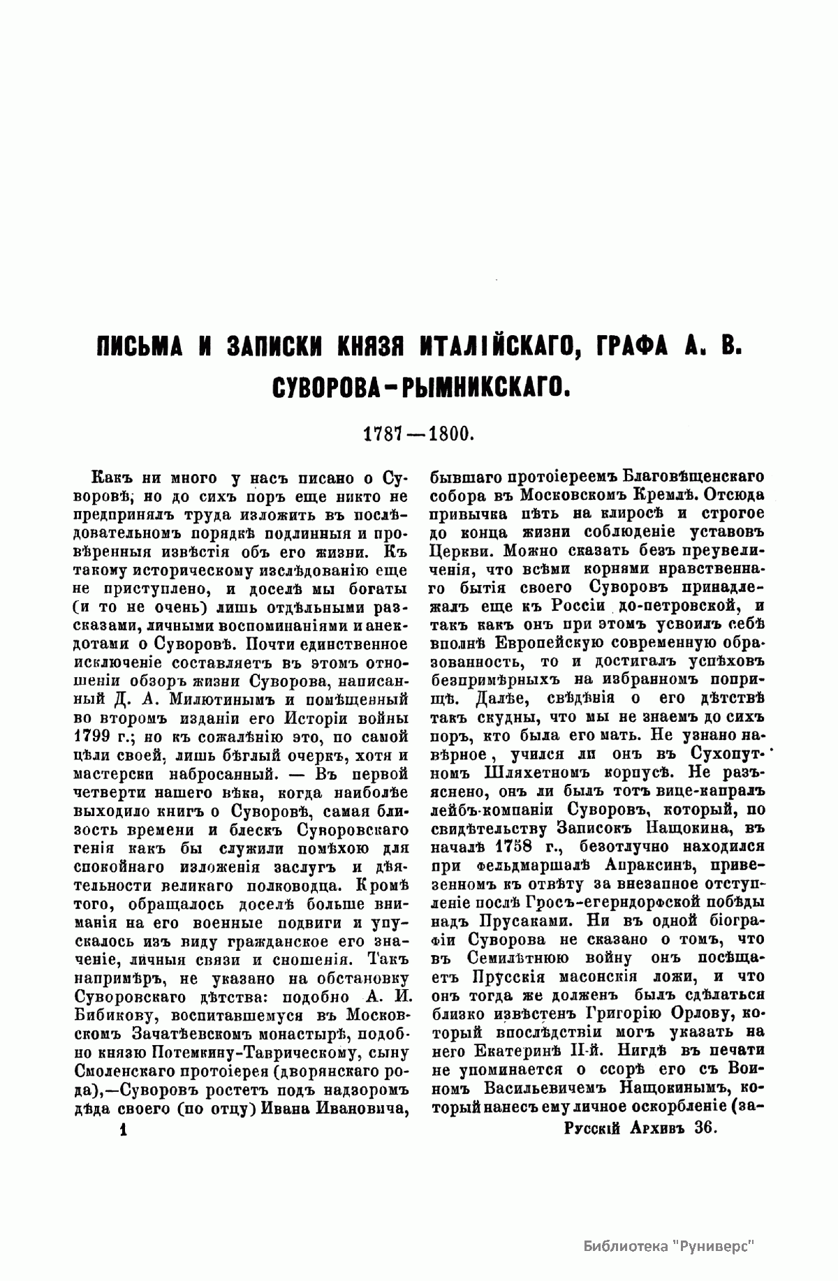 «Русский архив» — ежемесячный историко-литературный журнал, издававшийся в Москве с 1863 по 1917 год. Создателем и продолжительные годы редактором журнала был П. И. Бартенев – историк, археограф, библиограф. Этот журнал называли «живой картиной былого», поскольку он содержал преимущественно публикации неизданных мемуарных, эпистолярных, литературно-художественных и ведомственных документальных материалов, освещавших культурную и политическую историю России в XVIII и XIX вв. По числу опубликованных источников «Русский архив» стоит на первом месте среди русских исторических журналов.