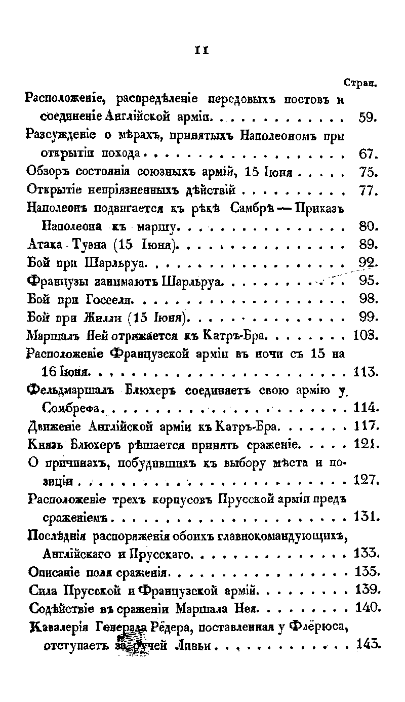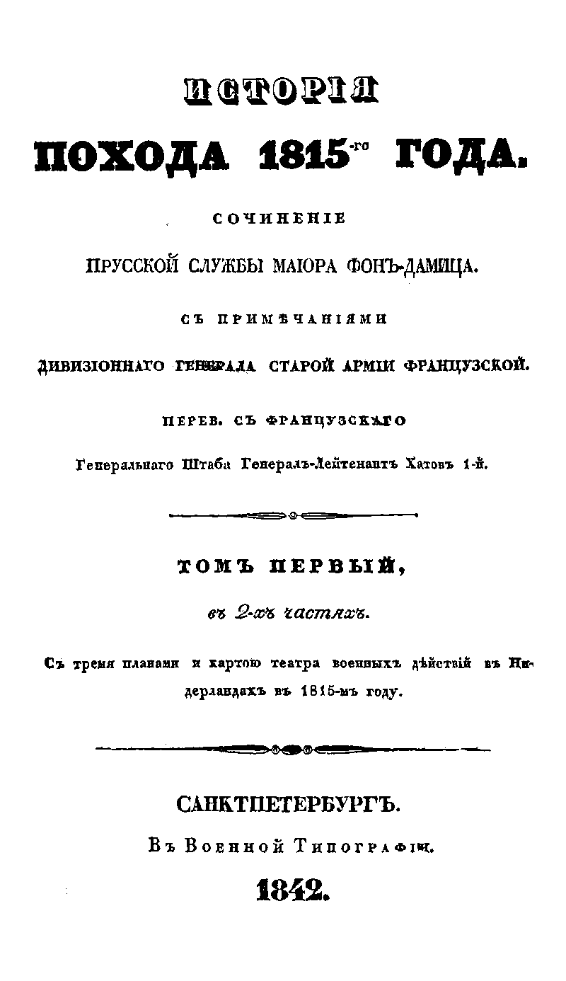 Данное уникальное по своей полноте издание содержит детальный анализ боевой деятельности союзных армий антинаполеоновской коалиции в военной кампании 1815 года (так называемые «Сто дней» после триумфального возвращения из ссылки с о. Эльба «императора французов» Наполеона Бонапарта). Обзор боевых действий союзных войск против Наполеона был подготовлен майором прусской армии К. фон Дамицем на основе донесений и личных воспоминаний прусского генерала К. фон Грольмана, занимавшего в этом походе пост генерал-квартирмейстера (начальника штаба) прусской армии под командованием фельдмаршала князя Блюхера-Вальштадского. Генерал Грольман фактически являлся соавтором этого военно-исторического труда, привлекшего значительный интерес военных специалистов всех европейских государств. Первое издание двухтомного описания кампании 1815 г. было опубликовано на немецком языке в Берлине в 1837-1838 гг., а затем было переведено на французский язык с комментариями. В дальнейшем, в 1841-1842 гг. этот труд был переведен на русский язык исправляющим должность директора Военно-учёного комитета видным военным администратором и переводчиком генерал-лейтенантом А.И. Хатовым и опубликован в «Военном журнале», а затем – в качестве самостоятельного издания. В книге описываются военные приготовления, бежавшего из ссылки Наполеона, подготовка сил союзников по антинаполеоновской коалиции соединение прусской (Нижне-Рейнской) и английской (Нидерландской) экспедиционных армий, выдвижение частей российской армии к Рейну, расположение корпусов армии фельдмаршала Блюхера. Детально описаны бой при Шарльруа, бой при Жилли, битва при Линьи, бой у Катр-Бра, описание мест сражения и ход битвы при Бель-Альянсе (Битва при Ватерлоо), бой при Вавре, бой под Намюром, взятие Авеня, взятие Гиза, бой в Компьене, бой в Вильер-Котере, бой при Сен-Дени, бой при Виллакубле, бой в Монбельяре, взятие Оксоня, осада и взятие Гюненга и др. В приложениях приводятся боевые расписания частей Российской императорской армии, находившейся в Западной Европе в 1815 г., расписания других армий и корпусов союзников, а также армии Наполеона, принимавших участие в боевых действиях. В качестве приложений ко 2-му тому приводятся документы об условиях капитуляции французской армии (соглашение в Сен-Клу от 3 июля 1815 г.). В книге представлены оригинальные карты и планы описываемых военных действий, боев и сражений.