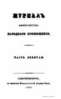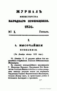 Журнал Министерства народного просвещения выходил с 1834-го по 1917 год. Официальный периодический журнал об успехах просвещения в России. Издатели журнала уверены в том, что «если для каждого человека необходим выход из грубой тьмы невежества и беспрерывное дальнейшее движение к свету, то для народов необходимо попечительное участие правительства в образовании. Только правительство имеет все средства знать и высоту успехов всемирного образования, и настоящие нужды Отечества».