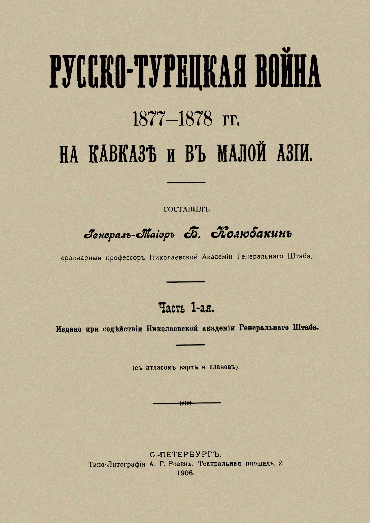 Колюбакин Борис Михайлович (1853–1924) — военный историк и писатель, генерал-лейтенант, участник русско-турецких войн, впоследствии — профессор Николаевской академии Генерального штаба. Его перу принадлежит ряд военно-исторических исследований и работ, большей частью посвященных войне с Турцией. Среди них — «Эриванский отряд в кампанию 1877–1878 гг.», «Воспоминания офицера Кобулетского отряда в кампании 1877–1878 гг.», «Конспект Русско-турецкой войны 1877–1878 гг.».