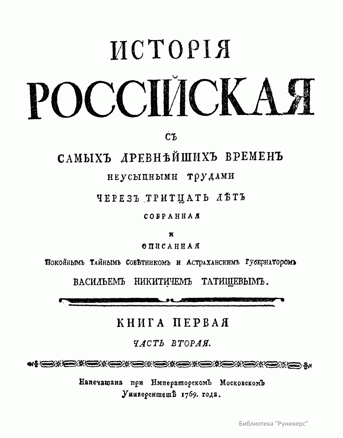 Исторiя Россiйская съ самыхъ древнѣйших временъ неусыпными трудами черезъ тритцать лѣтъ собранная и описанная покойным тайнымъ советникомъ и астраханскимъ губернаторомъ, Васильемъ Никитичемъ Татищевымъ. Книга первая. Часть вторая