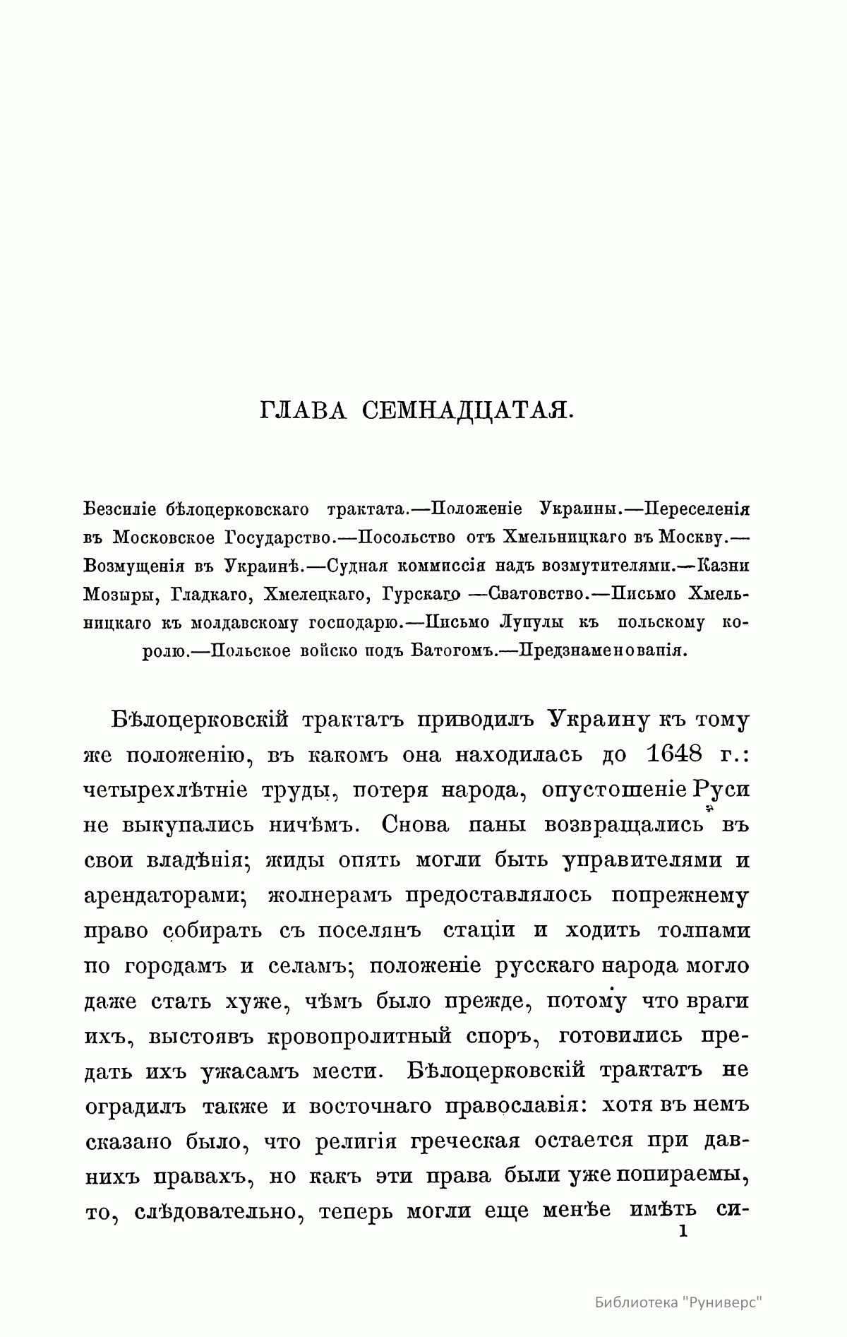 Перед читателем прижизненное издание трудов Н. И. Костомарова, в котором удачно соединялись историк-мыслитель и художник, что обеспечило ему не только одно из первых мест в ряду русских историков, но и наибольшую популярность среди читающей публики. Глубоко вдумываясь, почти вживаясь в изучаемую им старину, он воспроизводил ее в своих работах такими яркими красками, в таких выпуклых образах, что она надолго оставалась в памяти читателя. В первых трех томах и в двенадцатом томе опубликованы различные статьи. 1 – «Мысли о федеративном начале древней Руси»; «Черты народной южнорусской истории»; «Две русские народности»; «Мистическая повесть о Нифонте. Памятник русской литературы»; «Легенда о кровосмесителе»; «О значении Великого Новгорода»; «Должно ли считать Бориса Годунова основателем крепостного права?»; «Великорусские религиозные вольнодумцы в XVI веке. – Матвей Башкин и его соучастник Феодосий Косой»; «Иван Сусанин. Историческое исследование». 2 – «Иван Свирговский, украинский казацкий гетман XVI века»; «Гетманство Выговского»; «Бунт Стеньки Разина»; «По поводу мыслей светского человека, о книге «Сельское духовенство». 3 – «Куликовская битва»; «Ливонская война»; «Южная Русь в конце XVI века»; «Литовская народная поэзия»; «Об отношении русской истории к географии и этнографии». 12 – «Начало единодержавия в Древней Руси»; «Гетманство Юрия Хмельницкого»; «Церковно-историческая критика в XVII веке»; «История раскола у раскольников»; «Воспоминания о молоканах». Четвертый, пятый и шестой тома посвящены Смутному времени московского государства в начале XVII столетия. Седьмой и восьмой – истории Новгорода, Пскова и Вятки во время удельно-вечевого уклада. Девятый, десятый и одиннадцатый – Богдану Хмельницкому.