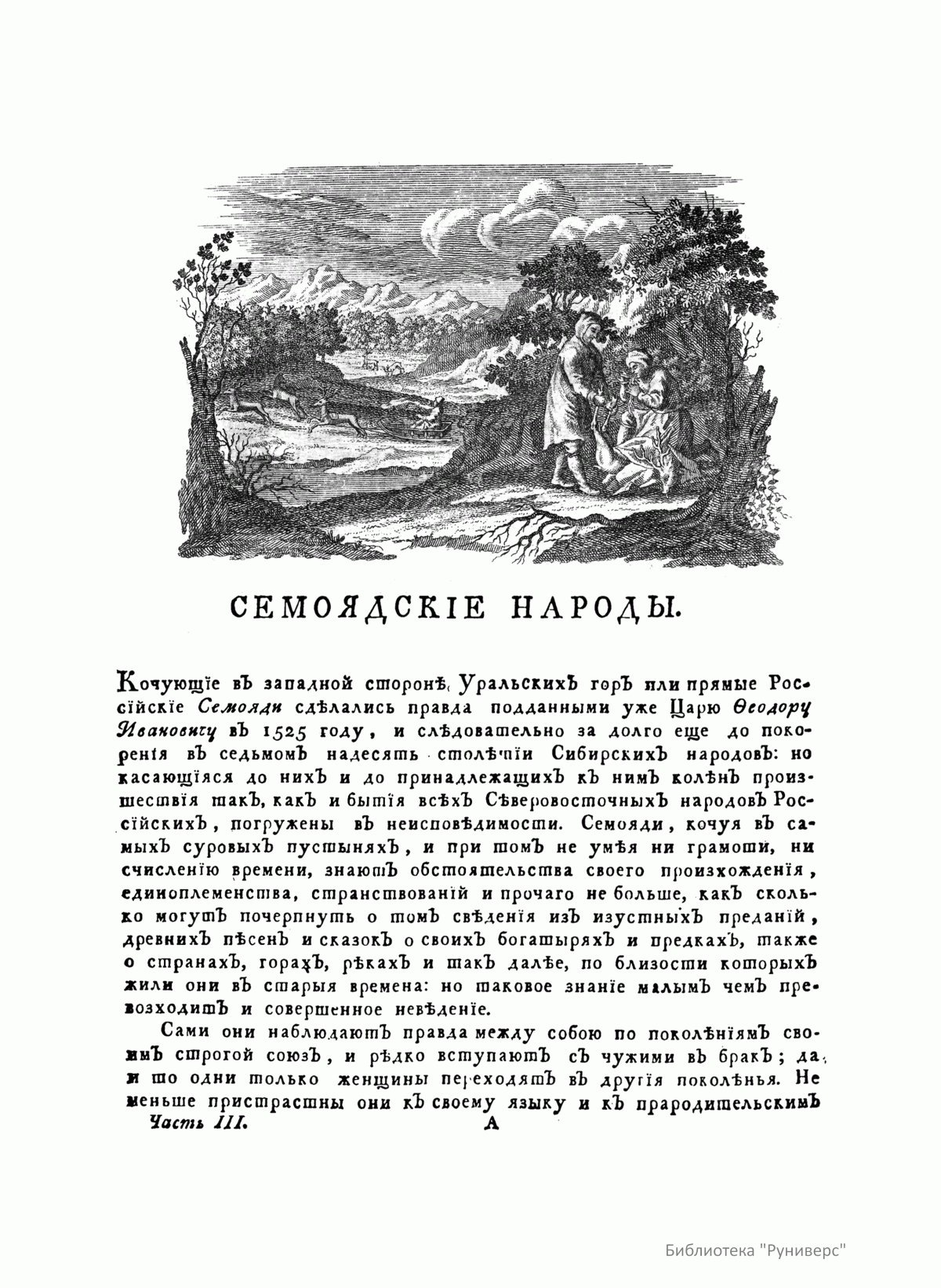 Описанiе всѣхъ обитающихъ въ Россiйскомъ государствѣ народовъ. Ихъ житейскихъ обрядовъ, обыкновенiй, одеждъ, жилищъ, упражненiй, забавъ, вѣроисповѣданiй и другихъ достопамятностей. Часть третiя о народахъ семоядскихъ, манджурскихъ и восточныхъ сибирскихъ какъ и о Шаманскомъ законѣ