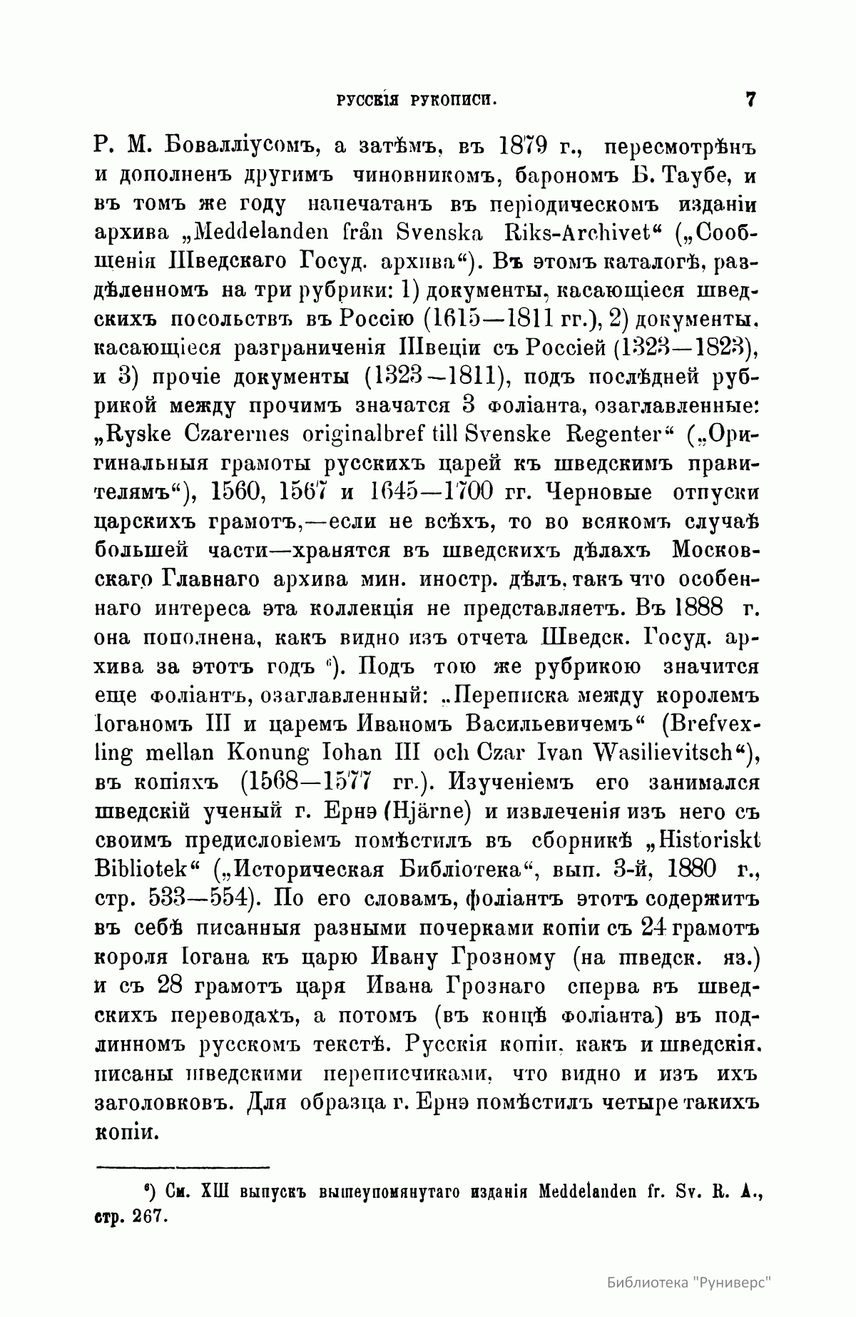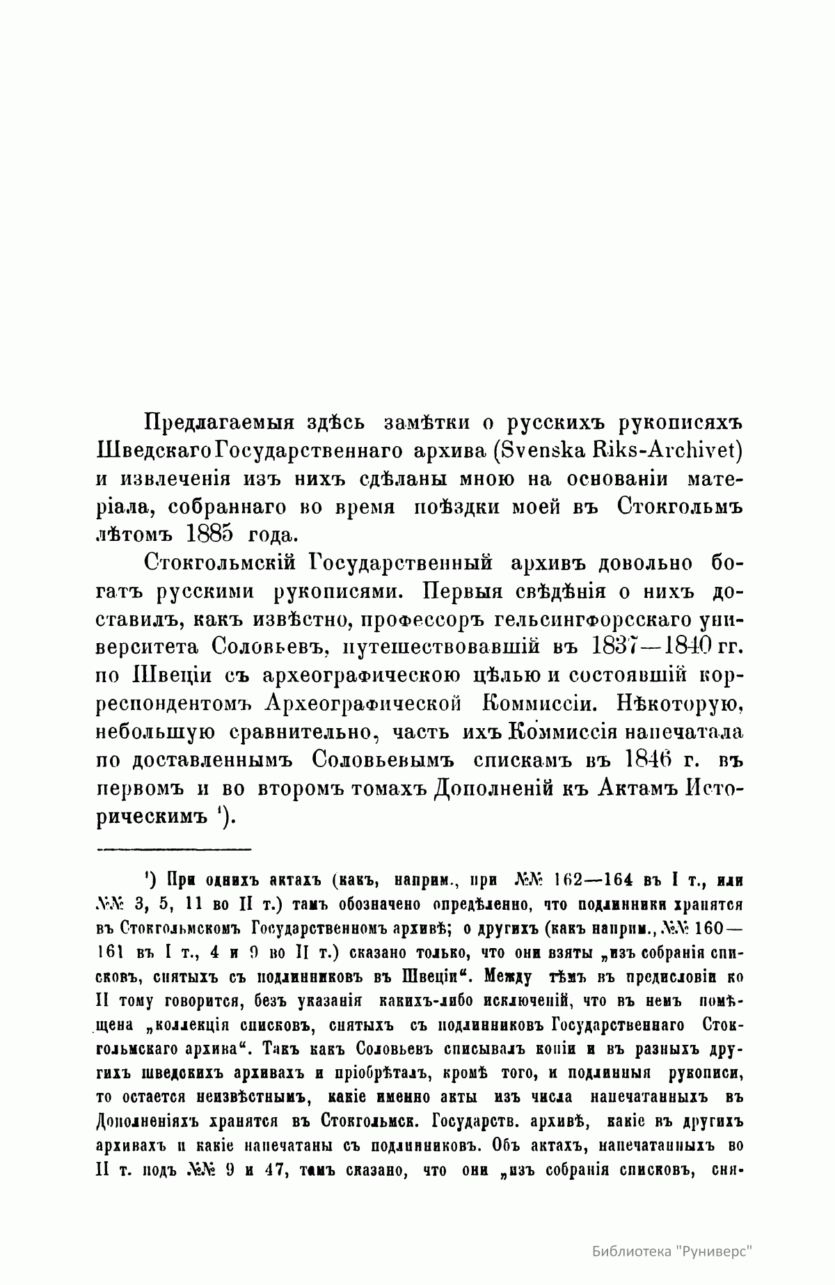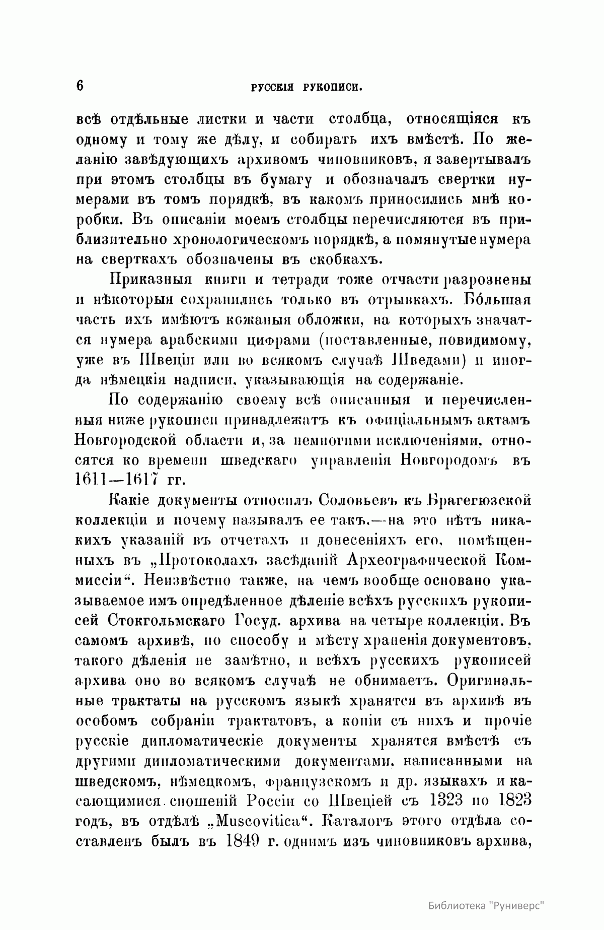 Русские документы Стокгольмского государственного архива на 1885 год состояли из четырех коллекций: делагардиевской (Яков Делагарди – шведский полководец, вывезший документы из Новгорода в начале XVII столетия), заключавшей до 500 свитков и до ста приказных книг и тетрадей; брагегюзской, содержавшей 17 разной величины столбцов; дипломатической, составленной из актов XV, XVI и XVII столетий; собрания 109 государственных актов и царских грамот. Эта коллекция в то время полностью не была систематизирована и описана. Документы настоящей публикации относятся к коллекции Делагарди. Здесь описано 47 столбцов (стр.12), и 118 приказных книг и тетрадей (стр. 41). В приложении к описанию столбцов (стр. 26) дается текст 19 грамот.