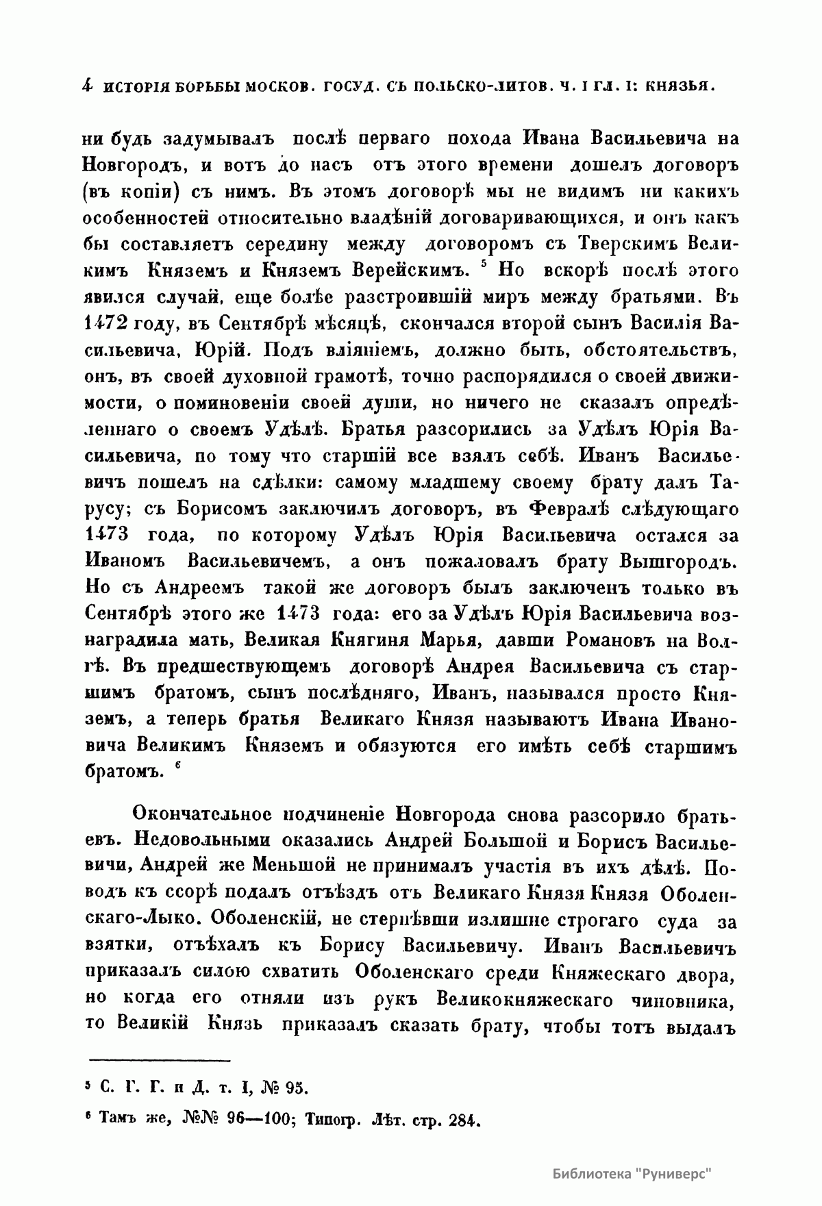 Настоящее издание представляет собой магистерскую диссертацию Карпова Геннадия Федоровича, после защиты которой (1867) он был назначен доцентом в Харьковский университет. Главным источником для изложения истории борьбы Московского государства с Польско-Литовским с 1462-го по 1508 г. служили московские и литовские государственные бумаги. В работе описывается новая эпоха политических отношений двух государств, наступившая с принятием Иваном III титула государя всея Руси и означавшая решимость Московского государства начать наступательное движение на Польско-Литовское. «Столкновение Московского государства с Польско-Литовским исходило из того, что все удельные князья, которые теряли свои владения в пользу Москвы, обыкновенно были союзниками и искали себе защиты и поддержки у представителей старых средневековых порядков, литовско-польских государей. Но главное, чего не могли видеть равнодушно в Польско-Литовском государстве, – это подчинение Москве Новгорода». Литовско-Польский государь приводил на помощь на Московское государство Степняков. Во второй половине XV века Степняки не были скучены в одну массу, а распадались на несколько Орд, причем главная из них, Золотая Орда, при всей своей слабости все еще закрывала собой отломившиеся от нее части. Эти части Золотой Орды были Крым, Казань, а по мере ослабления главной появлялись на сцену одна за другой более мелкие Орды и, наконец, разрозненные, в несколько сот и даже десятков человек – шайки татар, бродившие по степям и высматривавшие свою добычу. Но Степняки в борьбе Московского государства с Польско-Литовским получают значение как орудие, которым хотят управлять оба государства, поэтому их набеги не имеют никаких последствий. Оба государства могли решить свою борьбу только собственными средствами. Книга издана в двух частях. В первой части говорится об уничтожении удельной системы на Руси, завоевании Великого Новгорода и Степняках. Во второй части рассматриваются попытки литовцев остановить наступление со стороны Москвы посредством брачной политики, окончившиеся неудачей и приведшие к невыгодно завершившейся для литовцев войне.
