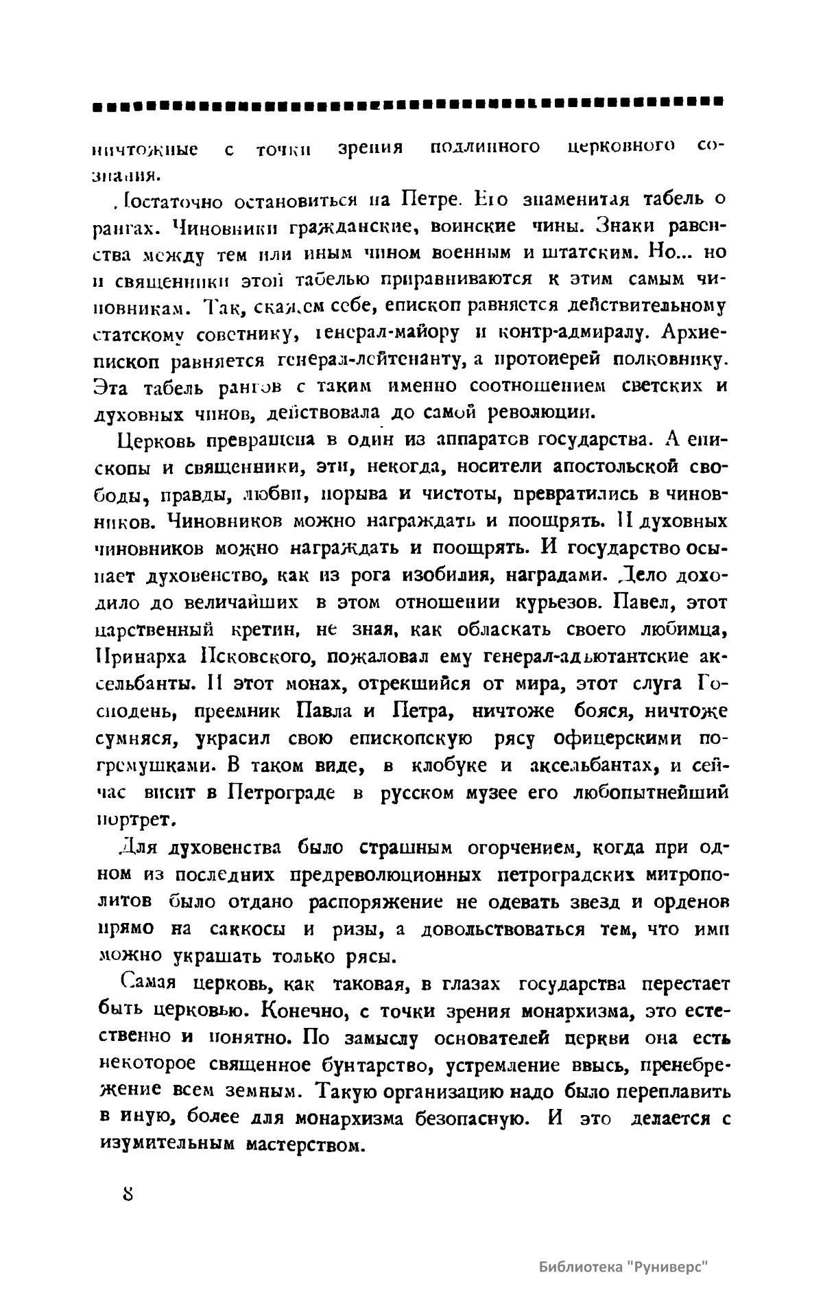 "Церковь и государство" - исторический очерк взаимоотношений церкви и государства в России 1918-1922 годов, где собран обширный материал об отношениях церкви и советского государства в этот период. В предисловии автор формулирует главную задачу своей книги - показать контрреволюционность и воинствующий монархизм Русской Церкви, а в заключение сделан вывод о необходимости церковного переворота. Книга содержит главы, без которых не может обойтись ни один историк церкви.