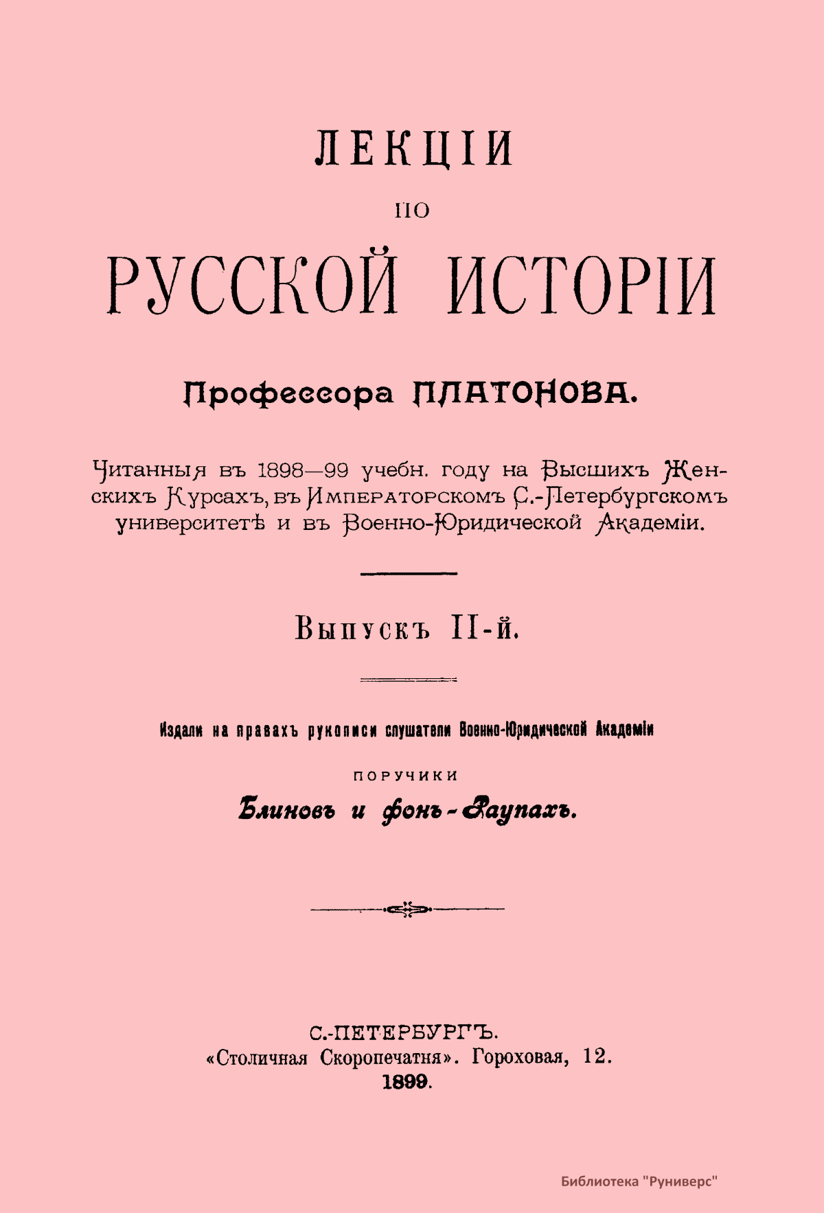Первым своим появлением в печати настоящие «Лекции» обязаны энергии и труду моих слушателей по Военно-юридической Академии, И. А. Блинова и Р. Р. фон-Раупаха. Они собрали и привели в порядок все те «литографированные записки», какие издавались учащимися в разные годы моего преподавания. Хотя некоторые части этих «записок» были составлены поданным мною текстам, однако, в общем, первые издания «Лекций» не отличались ни внутренней цельностью, ни внешней отделкой, представляя собою собрание разновременных и разнокачественных учебных записей. Трудами И. А. Блинова четвертое издание «Лекций» приобрело значительно более исправный вид, а к следующим изданиям текст «Лекций» пересматривался и лично мною.