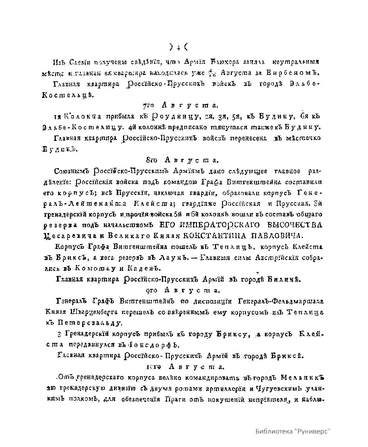 Журналъ Военныхъ движенiй и дѣйствiй Россiйско-императорскихъ и королевско Прусскихъ армiй со времени прекращенiя послѣдняго между ими и Армiями Французскими перемирiя т.е. с 5/17 Августа 1813 года