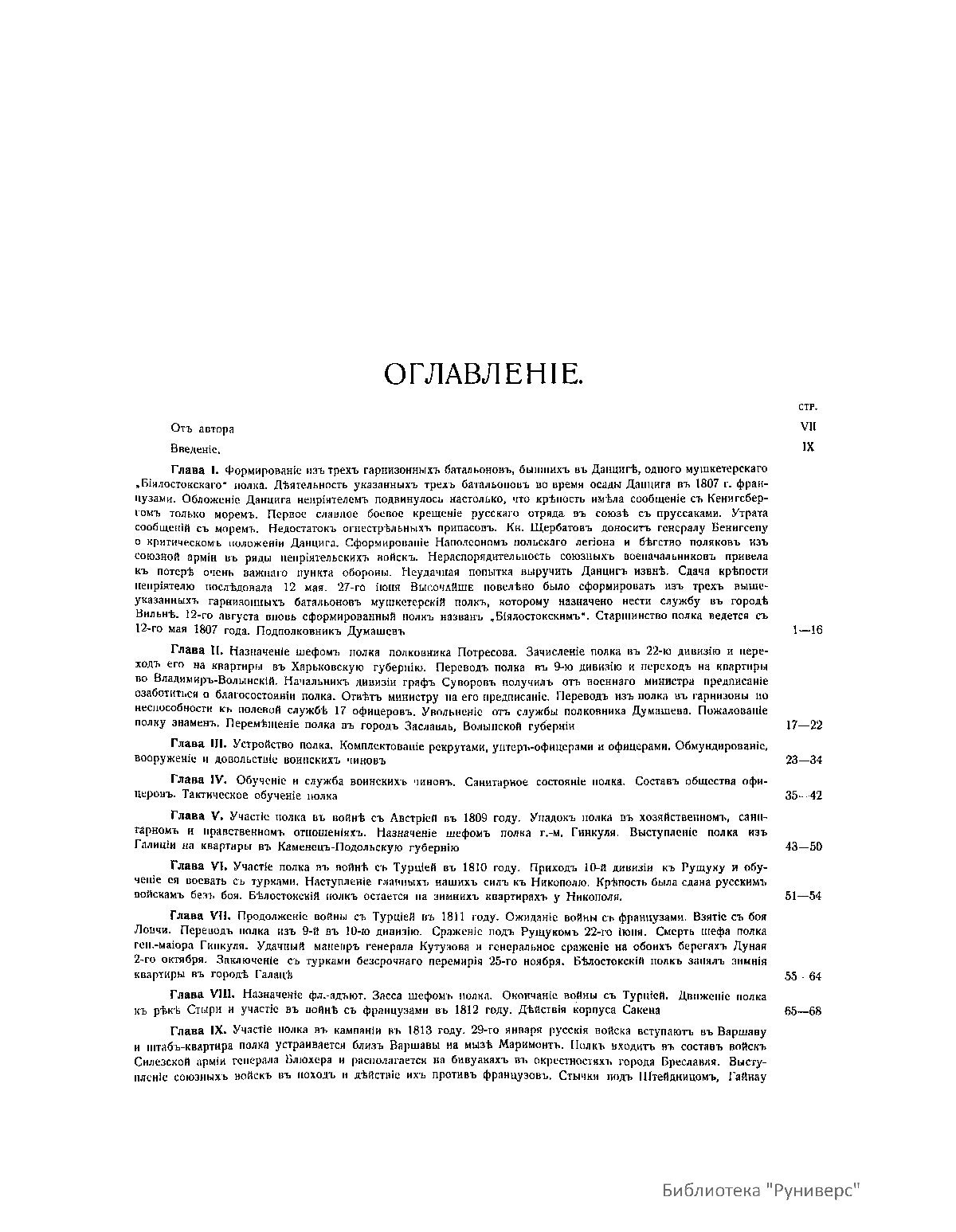 Обстоятельная история составлена капитаном Е. П. Николаевым и имеет целью представить более или менее полную и верную картину жизни полка. Перечень материалов, служивших пособием для автора, содержится в приложении № 96. Исторические материалы приводятся в строго хронологическом порядке. Оглавление с подробным содержанием каждой главы находится в начале книги. К книге прилагаются портреты, рисунки, карты, планы, схемы. Полк сформирован 12 мая 1807 г. в трехбатальонном составе из трех рот разных гарнизонных батальонов в уважение храброй защиты ими Данцига. Назван Белостокским мушкетерским полком. 22 февраля 1811 г. назван Белостокским пехотным полком. 14 февраля 1831 г. 3-й батальон отделен на сформирование Модлинского пехотного полка, взамен его поступил 3-й батальон Суздальского пехотного полка. 28 января 1833 г. присоединен 2-й батальон 47-го егерского полка, и полк приведен в шестибатальонный состав. 23 февраля 1845 г. присоединен один батальон Суздальского пехотного полка, а 16 декабря два батальона в полном составе отчислены на сформирование Ставропольского полка. 10 марта 1854 г. полк приведен в восьмибатальонный состав. 9 февраля 1856 г. сформированы стрелковые роты, а 23 августа полк приведен в трехбатальонный состав: 5-й, 6-й, 7-й и 8-й батальоны расформированы, а 4-й отделен под названием 4-го резервного батальона Белостокского пехотного полка (6 апреля 1863 г. из 4-го резервного батальона сформирован Белостокский резервный полк, названный 13 августа Рыльским пехотным полком). 25 марта 1864 г. полк назван 50-м пехотным Белостокским, а 30 августа 1873 г. – 50-м пехотным Белостокским Его Высочества герцога Саксен-Альтенбургского.