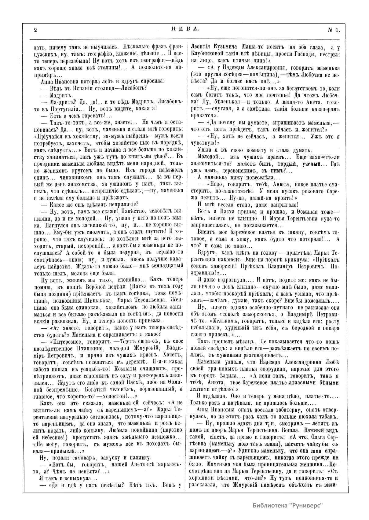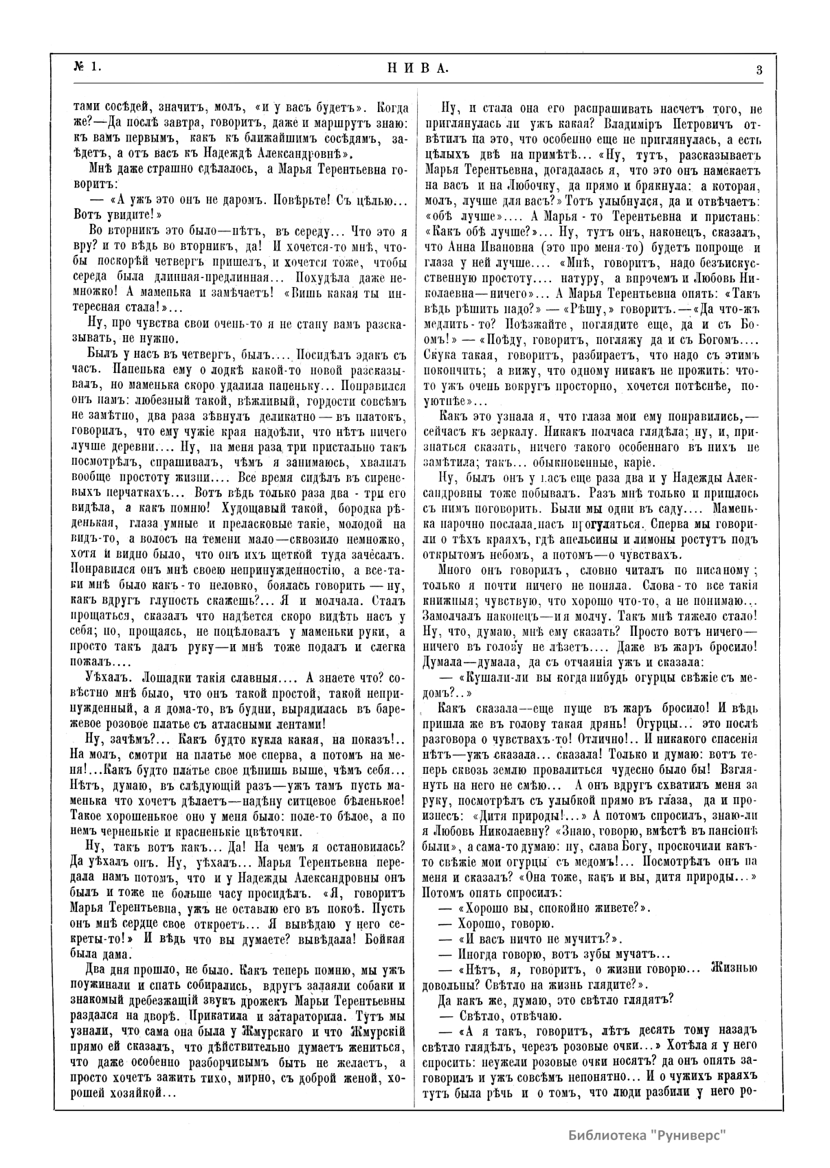 «Нива» — популярный еженедельный русский журнал с приложениями, издававшийся со второй половины XIX до начала XX века, носил подзаголовок «Журнал литературы, политики и современной жизни». Журнал был любимым детищем А. Ф. Маркса, возглавлявшего свое издательство вплоть до своей смерти в 1904 г. Позиционировалась «Нива» как иллюстрированный журнал для семейного чтения и был ориентирован, главным образом, на обывателя. В журнале публиковались литературные произведения, исторические, научно-популярные очерки, репродукции и гравюры картин современных художников. Материалы политического и общественного содержания также сопровождались многочисленными иллюстрациями. Среди известных литераторов, печатавшихся в журнале, были А. К. Толстой, Ф. И. Тютчев, Л. Н. Толстой, А. А. Фет, А. П. Чехов, Максим Горький, Корней Чуковский, Анна Ахматова, Иван Бунин и многие другие. Благодаря «Ниве» сочинения многих современных авторов добрались до самых отдаленных областей России.