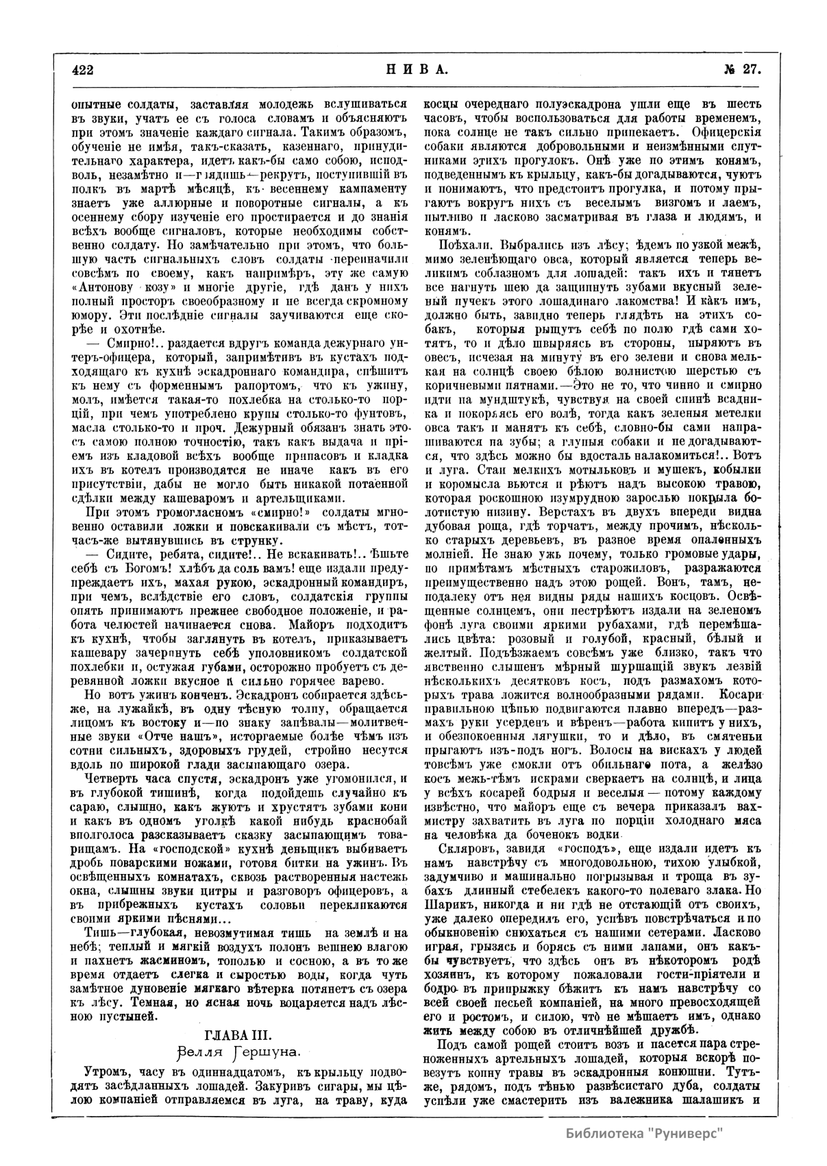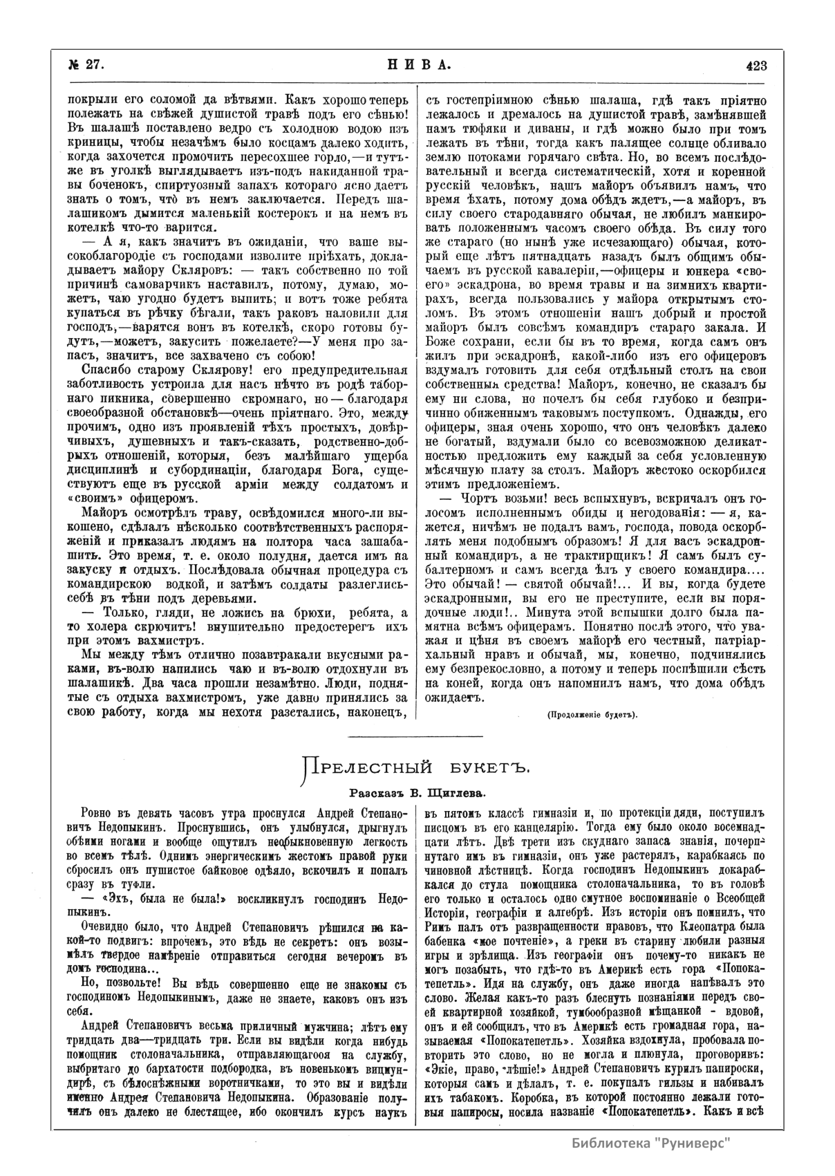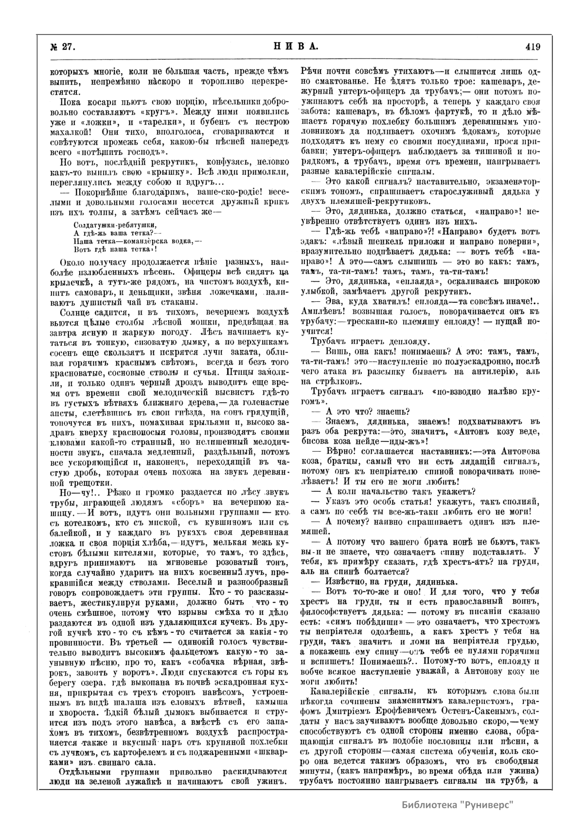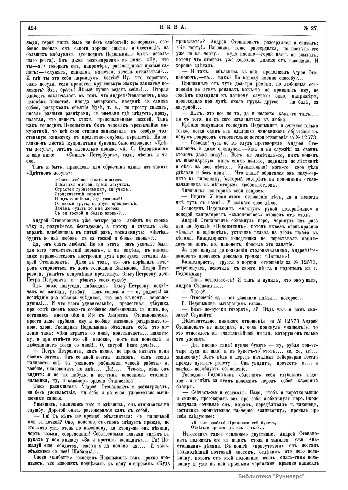 «Нива» — популярный еженедельный русский журнал с приложениями, издававшийся со второй половины XIX до начала XX века, носил подзаголовок «Журнал литературы, политики и современной жизни». Журнал был любимым детищем А. Ф. Маркса, возглавлявшего свое издательство вплоть до своей смерти в 1904 г. Позиционировалась «Нива» как иллюстрированный журнал для семейного чтения и был ориентирован, главным образом, на обывателя. В журнале публиковались литературные произведения, исторические, научно-популярные очерки, репродукции и гравюры картин современных художников. Материалы политического и общественного содержания также сопровождались многочисленными иллюстрациями. Среди известных литераторов, печатавшихся в журнале, были А. К. Толстой, Ф. И. Тютчев, Л. Н. Толстой, А. А. Фет, А. П. Чехов, Максим Горький, Корней Чуковский, Анна Ахматова, Иван Бунин и многие другие. Благодаря «Ниве» сочинения многих современных авторов добрались до самых отдаленных областей России.