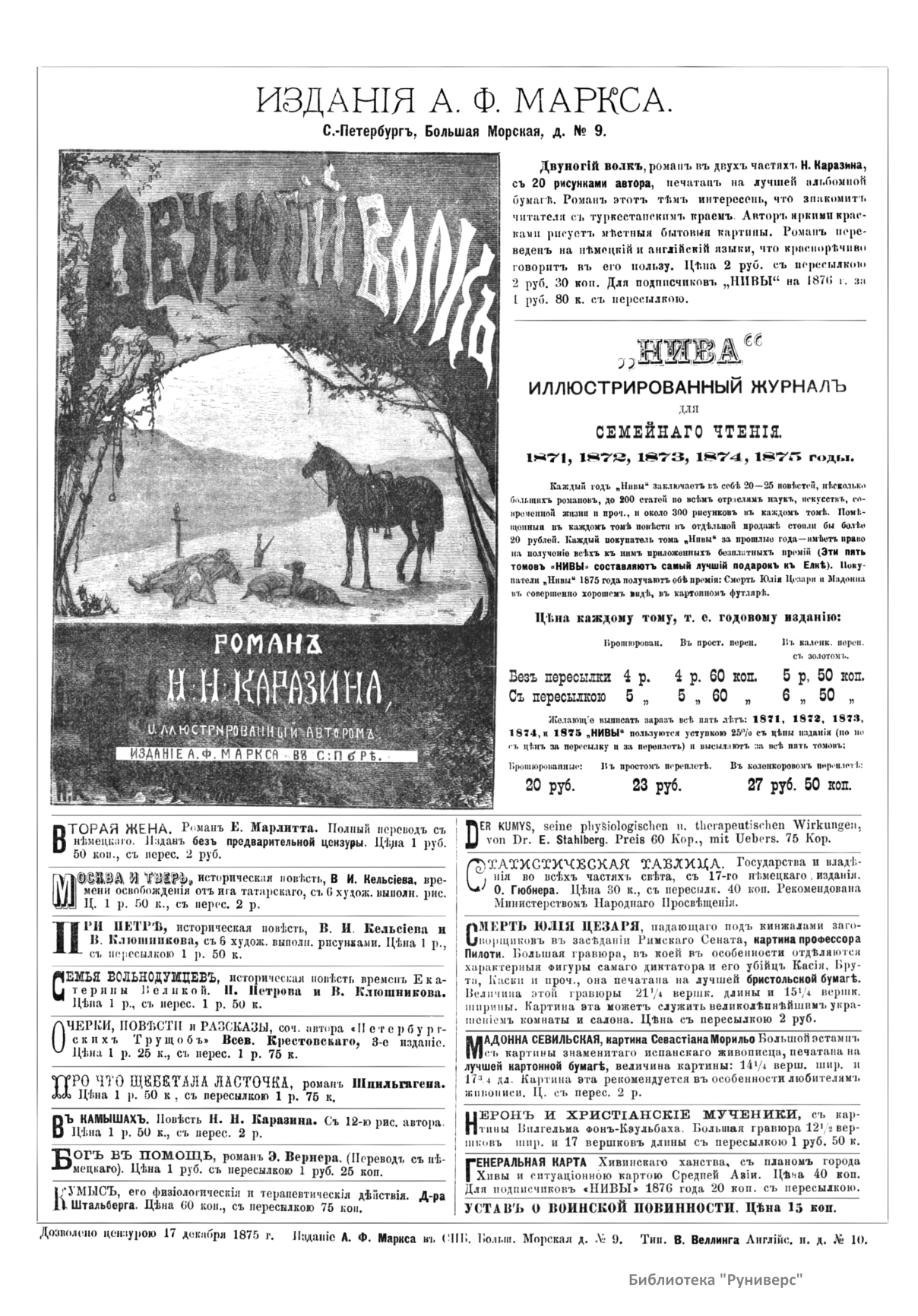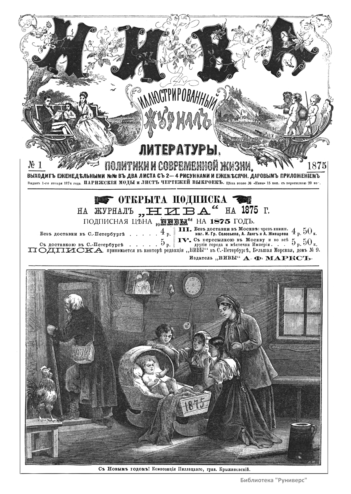 «Нива» — популярный еженедельный русский журнал с приложениями, издававшийся со второй половины XIX до начала XX века, носил подзаголовок «Журнал литературы, политики и современной жизни». Журнал был любимым детищем А. Ф. Маркса, возглавлявшего свое издательство вплоть до своей смерти в 1904 г. Позиционировалась «Нива» как иллюстрированный журнал для семейного чтения и был ориентирован, главным образом, на обывателя. В журнале публиковались литературные произведения, исторические, научно-популярные очерки, репродукции и гравюры картин современных художников. Материалы политического и общественного содержания также сопровождались многочисленными иллюстрациями. Среди известных литераторов, печатавшихся в журнале, были А. К. Толстой, Ф. И. Тютчев, Л. Н. Толстой, А. А. Фет, А. П. Чехов, Максим Горький, Корней Чуковский, Анна Ахматова, Иван Бунин и многие другие. Благодаря «Ниве» сочинения многих современных авторов добрались до самых отдаленных областей России.