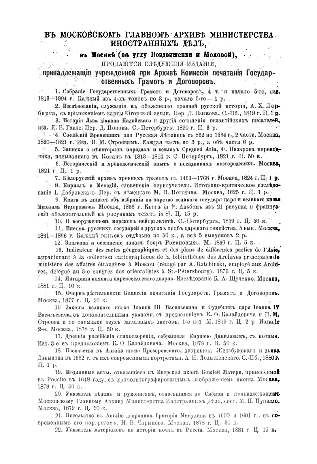 Посмертное издание ключевого труда бессменного (в течение почти 50 лет) археографа и управляющего Московским Главным архивом коллегии иностранных дел - систематизированное изложение документов о посольствах между российскими монархами и европейскими державами, дипломатической переписки и договоров.