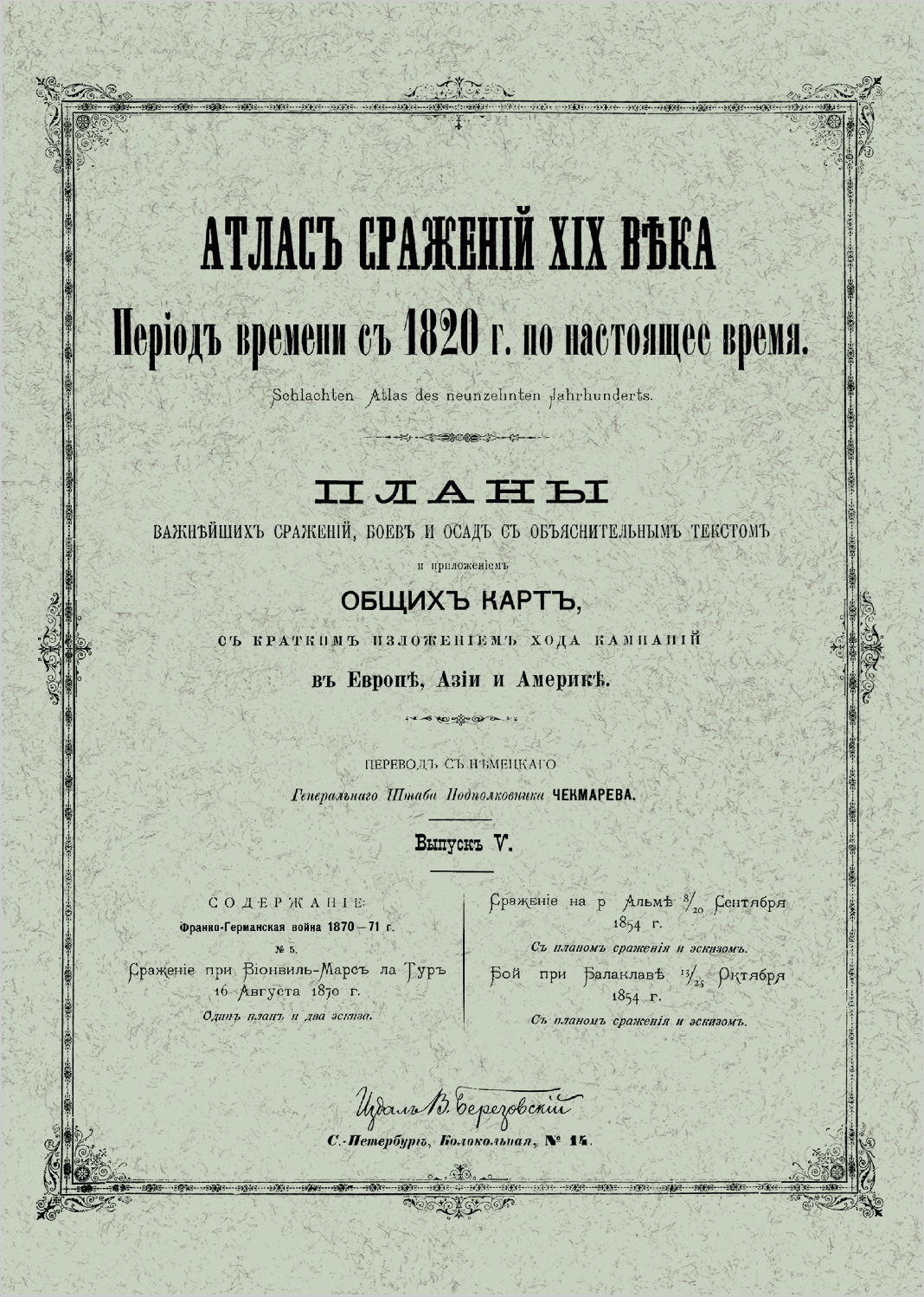 Второе издание «Атласа сражений XIX века» в 20-ти выпусках, представляет собой перевод на русский язык, выпускавшегося в военно-научном комитете Главного штаба на немецком языке с 1830-х гг., разрозненного собрания карт и планов военных кампаний армий мира в XIX века. Переводчиком данного издания является Виктор Иванович Чекмарев (1861–1939) — генерал-лейтенант (1912), видный военный деятель российской императорской армии, историк, участник Первой мировой войны и белого движения на юге России, впоследствии в эмиграции. С 1894 г., занимая должность делопроизводителя, а затем столоначальника канцелярии военно-ученого комитета Главного Штаба, подполковник Генерального Штаба Чекмарев, в результате кропотливой работы собрал воедино «Атлас сражений XIX века», каждый выпуск которого посвящен одной или нескольким военным кампаниям Европы, Азии и Америки, содержит подробное описание расположения войск и хода боевых действий противников, хронологию событий, снабжен картами и планами сражений. Это издание имеет большую историко-культурную ценность, интересно как ученым-историкам, так и любителям военно-исторической литературы.