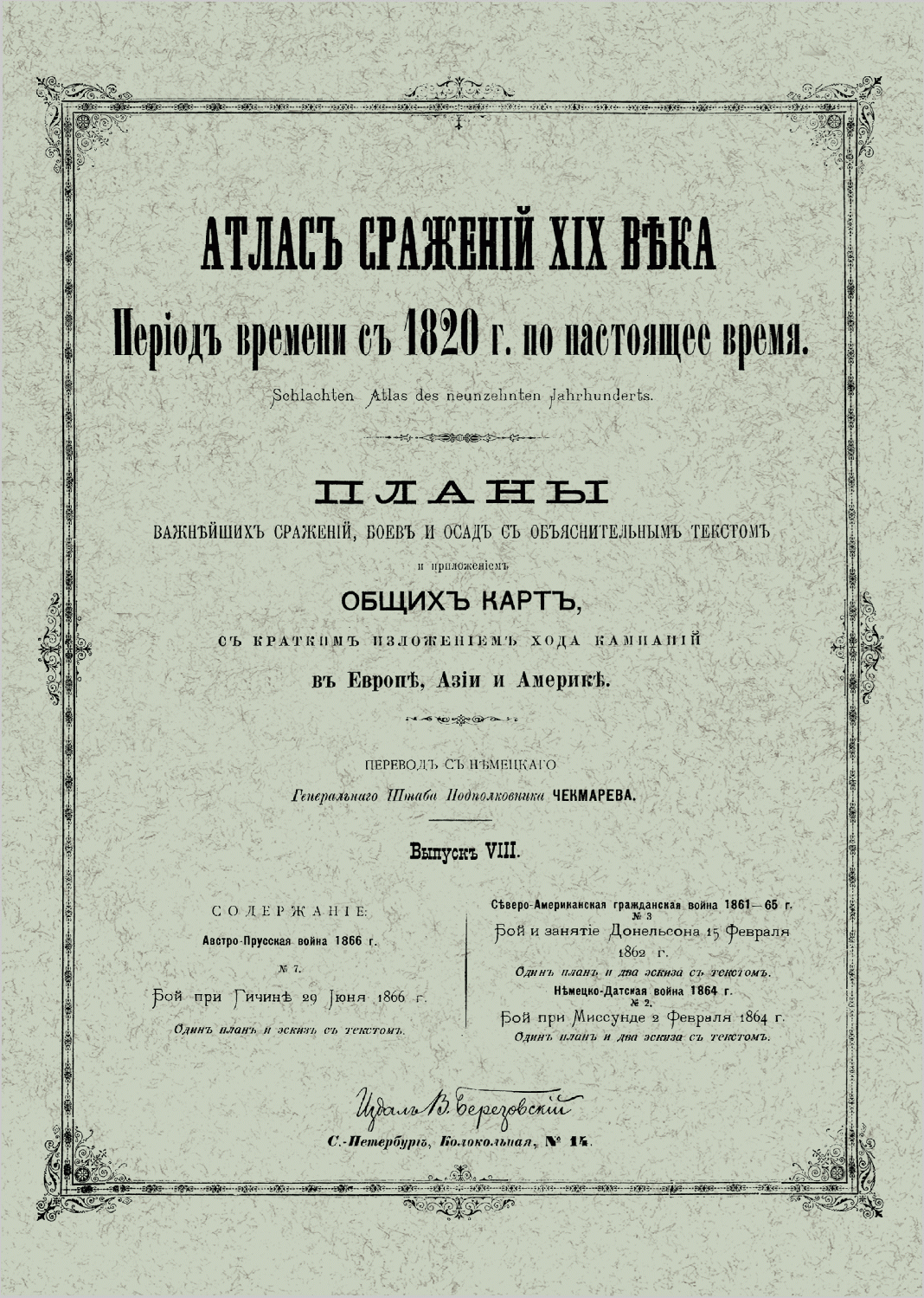 Второе издание «Атласа сражений XIX века» в 20-ти выпусках, представляет собой перевод на русский язык, выпускавшегося в военно-научном комитете Главного штаба на немецком языке с 1830-х гг., разрозненного собрания карт и планов военных кампаний армий мира в XIX века. Переводчиком данного издания является Виктор Иванович Чекмарев (1861–1939) — генерал-лейтенант (1912), видный военный деятель российской императорской армии, историк, участник Первой мировой войны и белого движения на юге России, впоследствии в эмиграции. С 1894 г., занимая должность делопроизводителя, а затем столоначальника канцелярии военно-ученого комитета Главного Штаба, подполковник Генерального Штаба Чекмарев, в результате кропотливой работы собрал воедино «Атлас сражений XIX века», каждый выпуск которого посвящен одной или нескольким военным кампаниям Европы, Азии и Америки, содержит подробное описание расположения войск и хода боевых действий противников, хронологию событий, снабжен картами и планами сражений. Это издание имеет большую историко-культурную ценность, интересно как ученым-историкам, так и любителям военно-исторической литературы.