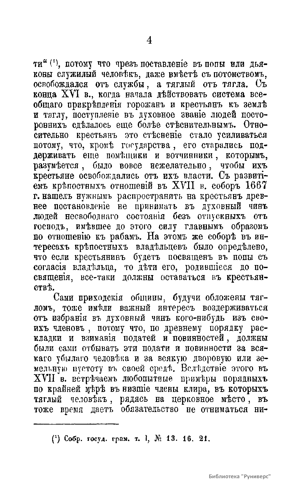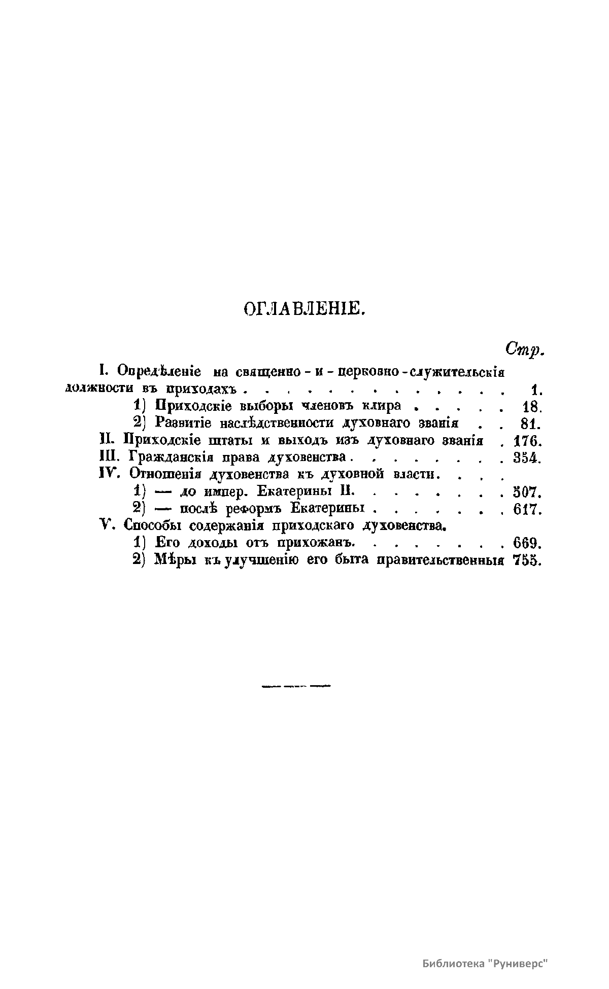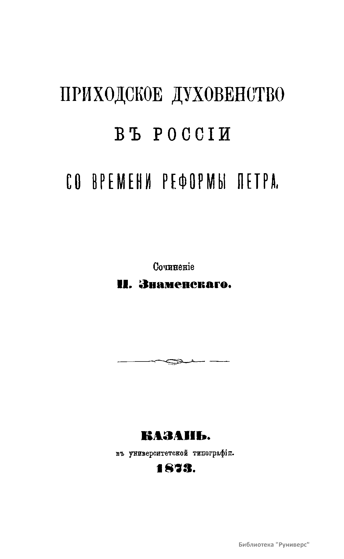 Докторская диссертация Знаменского П.В. исследует правовое положение духовенства в России со времени реформы Петра I. В работе содержатся следующие положения: определение на священно- и церковнослужительские должности в приходах; приходские штаты и выход из духовного звания; гражданские права духовенства; отношение духовенства к духовной власти; способы содержания приходского духовенства.