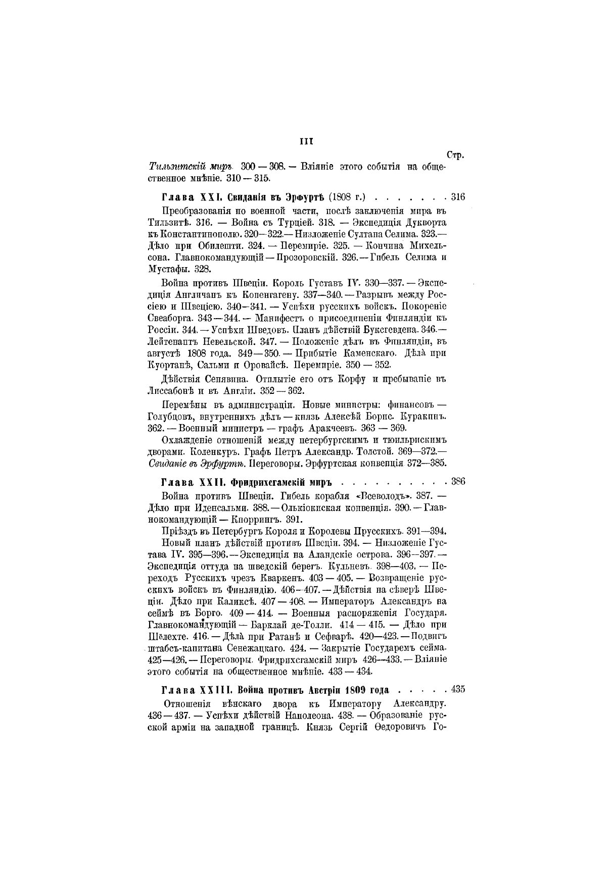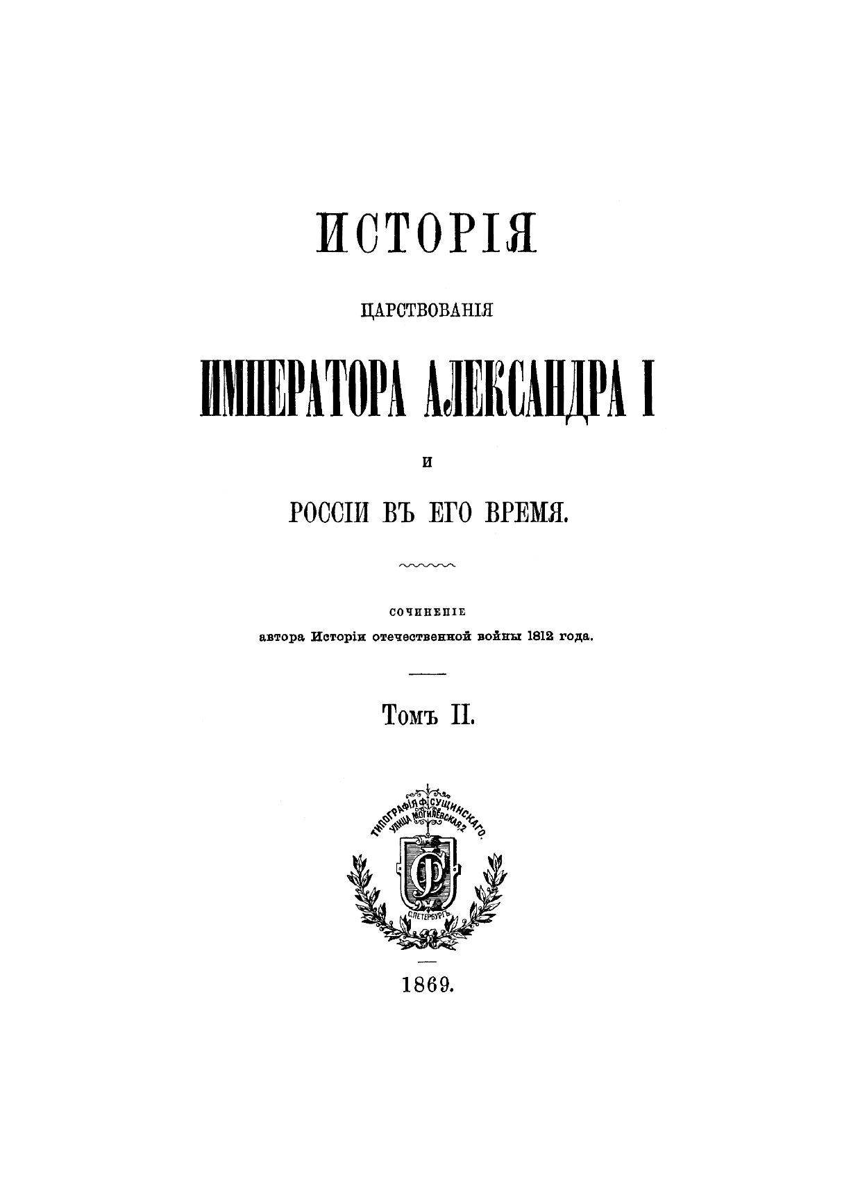 «История царствования императора Александра I и России в его время» вышла в свет в 1869–1871 гг. Ее автор, Богданович Модест Иванович (1805–1882), — генерал-лейтенант, военный писатель. В 1831 г. участвовал в сражениях под Вавром, Гроховым, Дембе-Вельке и Рагозиным. Пройдя курс в военной академии, занял в ней кафедру военной истории и стратегии, был членом Военного совета, официальным военным историографом. Оставил после себя множество военно-исторических и исторических трудов, в которых интересуется, главным образом, политической историей; его попытки критически отнестись к создавшимся легендам были встречены официальными историками весьма недоброжелательно. Повествование разделено на две части: первая, заключающаяся в I–IV томах, охватывает события 1801–1815 гг.; вторая — V, VI тома — содержит исторический период после 1815 г. до кончины Александра I в 1825 г. При создании книги Богданович использовал сведения из государственных архивов, а также до того не издававшиеся документы: бумаги императора Александра I, графа П. А. Строганова, записки адмирала А. С. Шишкова, журнал морских походов Д. Н. Сенявина и др. Полный список источников, печатных книг и рукописей, приведен в конце шестого тома. Богатый фактический материал иллюстрируют карты театров военных действий и планы главных сражений.