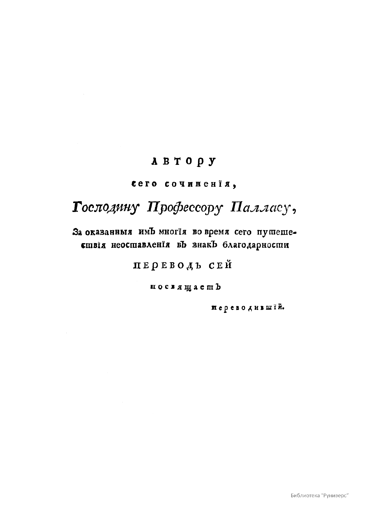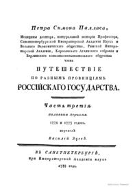 Научные труды П.С. Палласа выходили сначала на родном ему, немецком языке, а потом переводились на русский. Перевод с немецкого труда «Путешествие по разным местам Российского государства» в трех частях (пяти книгах) был выполнен Ф. Туманским и учеником Палласа, Василием Зуевым, состоявшим в его экспедиционном отряде. Впервые на русском языке «Путешествие…» было издано в 1773–1788 гг. в серии «Собрания, старающегося о переводе иностранных книг», учрежденной Екатериной II.