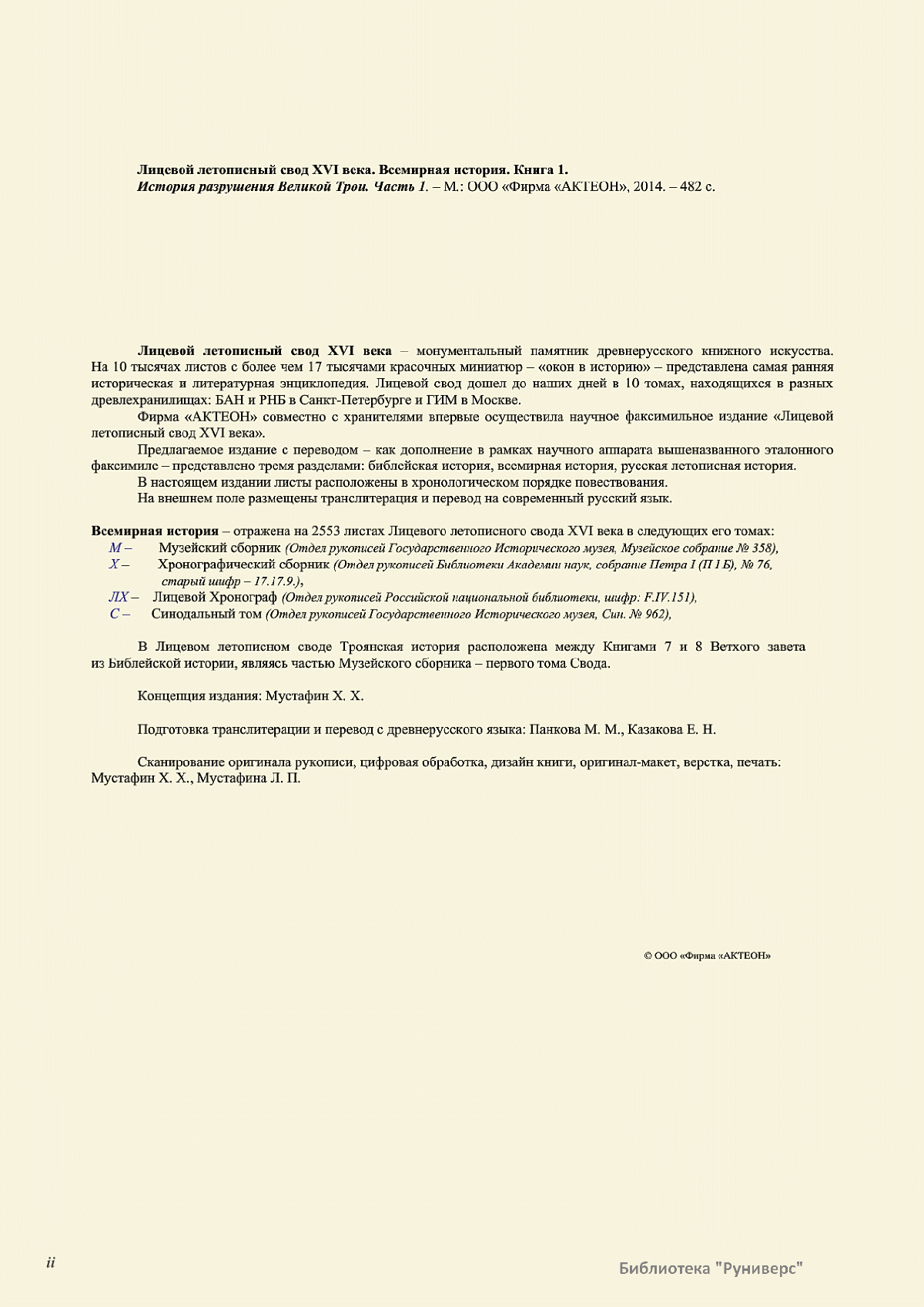 Лицевой летописный свод. XVI века — монументальный памятник древнерусского книжного искусства. На 10 тысячах листов с более чем 17 тысячами красочных миниатюр — «окон в историю» — представлена самая ранняя историческая и литературная энциклопедия. Лицевой свод дошел до наших дней в 10 томах, находящихся в разных древлехранилищах: БАН к РНБ в Санкт-Петербурге и ГИМ в Москве. Фирма «АКТЕОН» совместно с хранителями впервые осуществила научное факсимильное издание «Лицевой летописный свод XVI века». Предлагаемое издание с переводом — как дополнение в рамках научного аппарата вышеназванного факсимиле - представлено тремя разделами: библейская история, всемирная история, русская летописная история. В настоящем издании листы расположены в хронологическом порядке повествования На внешнем поле размещены транслитерация и перевод на современный русский язык. Русская летописная история 1114—1567 гг. — отражена на 6010 Лицевого летописного свода XVI века в следующих его томах: Г — Голицынский том (Отдел рукописей Российский национальной библиотеки, F.IV.225), Л — Лаптевский TOM (Отдел рукописей Российской национальной библиотеки, F.IV.233), O-I — Остермановский первый том (Отдел рукописей Библиотеки Академии наук, 31. 7. 30-1), O-II — Остермановский второй той (Отдел рукописей Библиотеки Академии наук, 31, 7. 30-2), Ш — Шумиловский том (Отдел рукописей Российской национальной библиотеки, F, IY. 232), С — Синодальный том (Отдел рукописей Государственного Исторического музея. Син. № 962), Ц— Царственная книга (Отдел рукописей Государственного Историческою музея. Син. № 149). В сносках отряжены разночтения с перепей ПСРЛ — Полным собранием русских летописей - фундаментальной для изучения истории древней и средневековой Руси книжной серией (её тексты, в основном, издавались наборно, в орфографии XIX века).