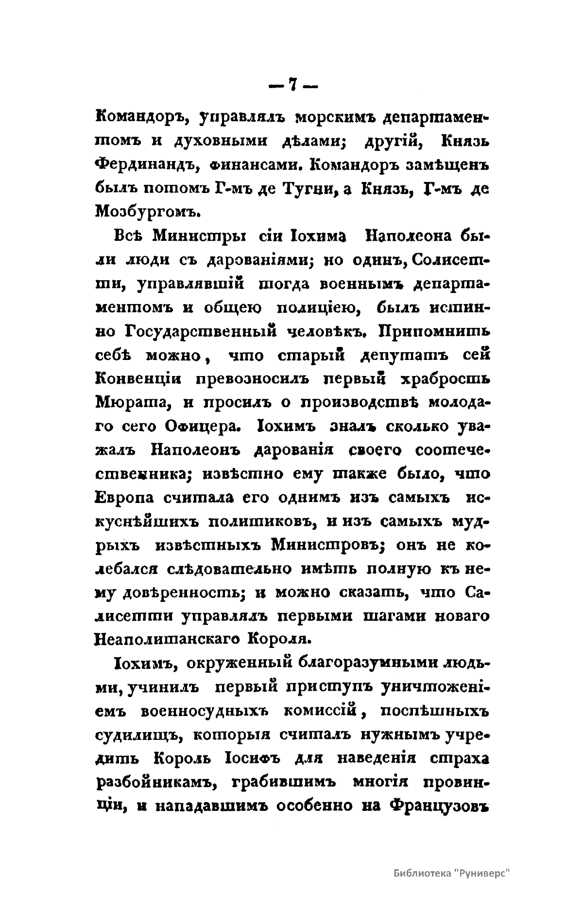 «История Иохима Мюрата, зятя Наполеонова, бывшаго короля Неаполитанскаго» Л.-Ш. Галлуа вышла в свет в России в 1830 г., через почти двадцать лет после событий Отечественной войны 1812 г. Автор книги был установлен по парижскому изданию 1828 г. Современник Мюрата, Галлуа собрал и обработал интересный материал, касающийся как непосредственно биографии знаменитого маршала, так и наполеоновской эпохи в целом. Сын трактирщика, ученик духовной семинарии, Иоахим Мюрат сделал блестящую карьеру военного и политического деятеля. Получил звание маршала Франции, корону Неаполитанского королевства, титул герцога Бергского, Великого адмирала, принца империи. Был женат на сестре Бонапарта Каролине. Мюрат принимал участие практически во всех военных кампаниях и крупных сражениях наполеоновских войн, проявив себя талантливым военачальником. Во время войны с Россией был назначен командующим кавалерией французской армии, лично водил в атаку кирасиров на укрепления русских войск в Бородинской битве, в сражении при Тарутино Мюрату удалось спасти остатки французской армии и выйти из окружения противника.