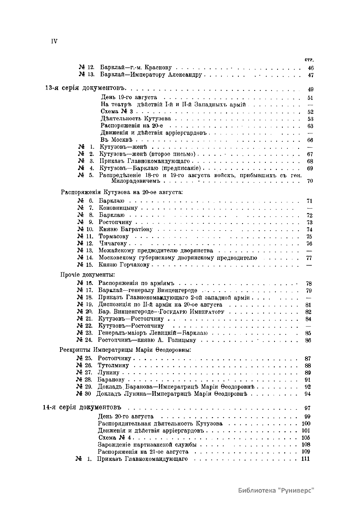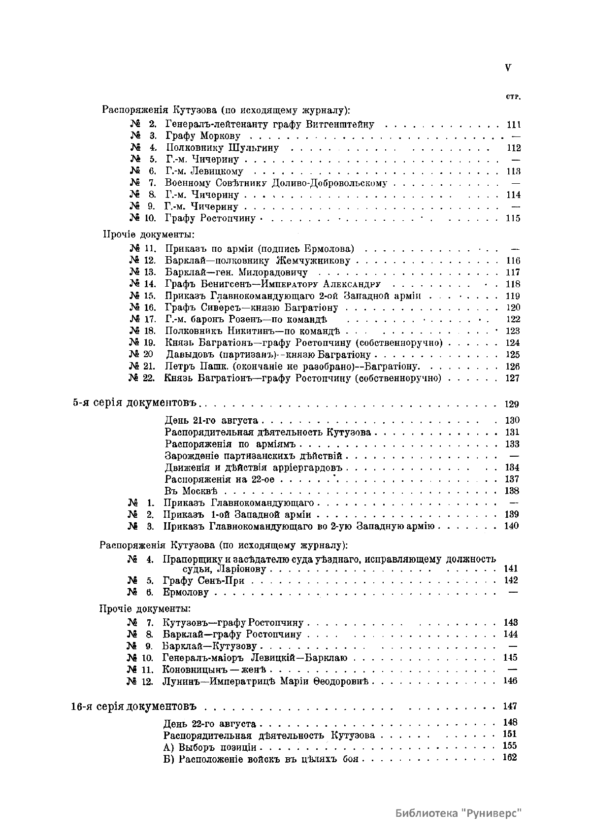 К столетнему юбилею Бородинского сражения по поручению Императорского Русское военно-исторического общества была подготовлена подневная хроника Бородинской операции с 8 по 26 августа 1812 года, составившая три тома (с V по VII тома Трудов ИРВИО). Окончание хроники за 24–26 августа осталось неопубликованным. В книге собраны и документы-первоисточники по Бородинскому сражению, как наиболее яркому событию всей военной кампании, сражению, в подготовке и проведении которого наиболее явно отразились все положительные и отрицательные стороны военной системы. Документы расположены по дням, объединены в серии, каждой серии предшествует объяснительный текст.