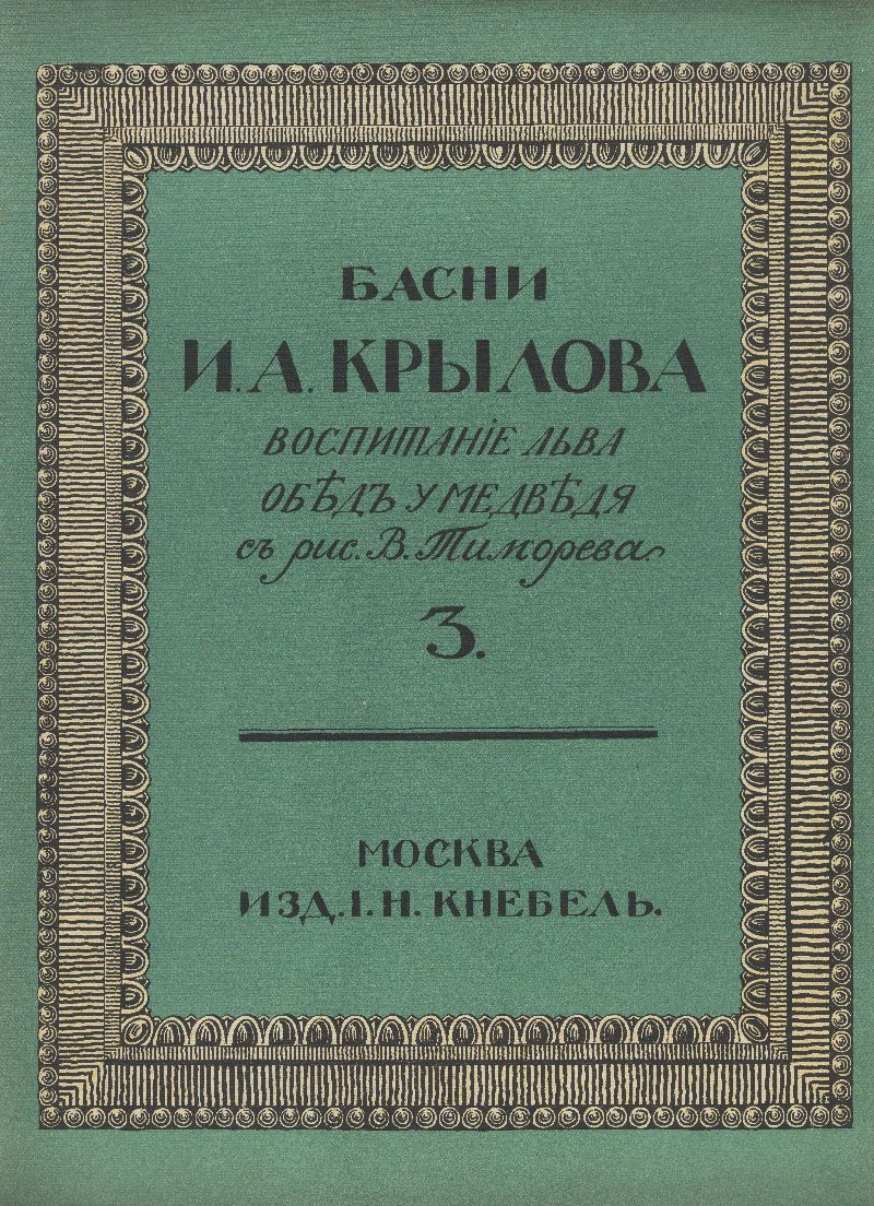 Возможно, Кнебель хотел привлечь к иллюстрированию басен различных художников. Так, например, издание 1912 года иллюстрирует Егор Нарбут. Серия оформлена в стилистике классицизма – своеобразная дань Крылову и его эпохе. Иллюстрации Тиморева на первый взгляд могут показаться не особо изящными. Они выполнены яркими красками против черно-белых точеных силуэтов Нарбута и написаны слишком натуралистично. Такие иллюстрации не соответствуют художественной эстетике начала ХХ века, но, возможно, именно такова и была задумка Кнебеля и Тиморева – изобразить героев басен в классицистическом стиле.