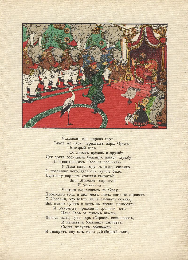 Многие рисунки вставлены в специальные рамки, которые призваны подчеркнуть эстетику ушедшей эпохи ампира, в которую жил и творил автор басен. Яркие цветные иллюстрации с «очеловеченными» персонажами мира зверей были намного более воспринимаемы детьми, чем отстраненная, «взрослая» графика Нарбута.