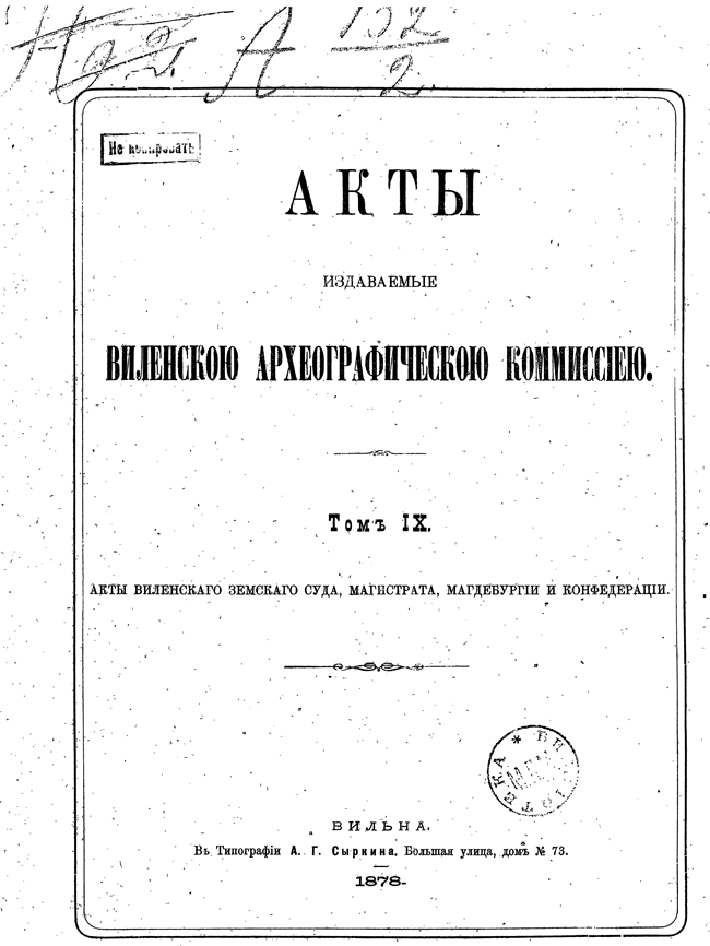Обилие актов и документов Виленского центрального архива (19244 актовых книг) и желание исследовать прошлое Литвы, которая и в старину принадлежала России, вызвали после 1863 года учреждение особой комиссии для разбора в городе Вильне древних актов.