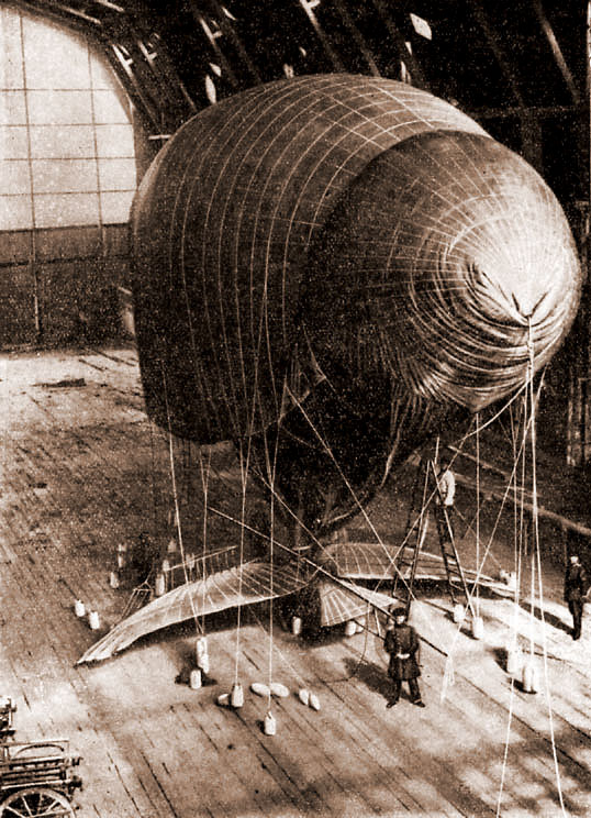 Воздухоплавательный аппарат конструкции И. А. Матюнина в Охтенской верфи в 1891 г. Фотограф неизвестен ФЦГВИА, ф.3, оп. 14, д. 2299, л. 153 Фрагмент. Смотреть полностью.