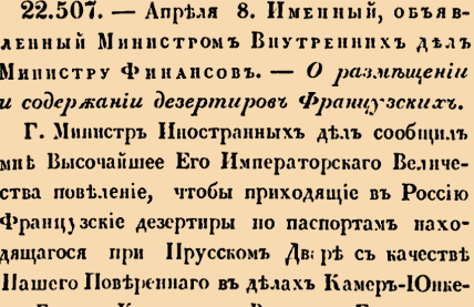 Г.Министр Иностранных дел сообщил мне Высочайшее Его Императорскаго Величества повеление, чтобы приходящие в Россию Французские дезертиры по паспортам находящагося при Прусском Дворе с качестве Нашего Повереннаго в делах Камер-Юнкера Барона Криднера и Военных Генералов, отправляемы были по городам внутри России состоящим, не смешивая их там, где находятся, или куда назначены Французские военнопленные, имея однакож за ними присмотр, так как и за сими последними.