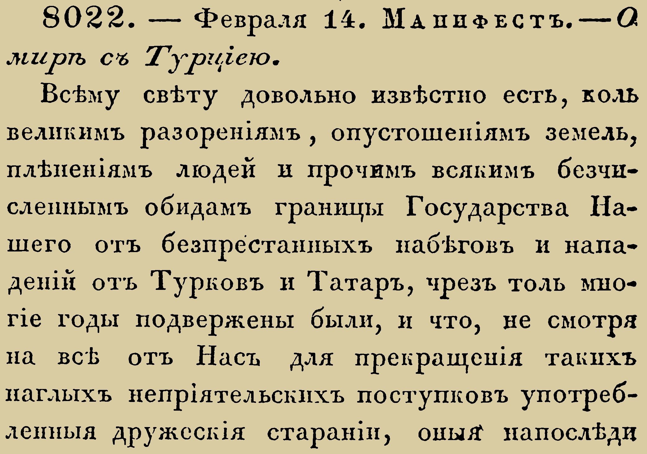 8022.- Февраля 14. Манифестъ.- О мирѣ съ Турціею.