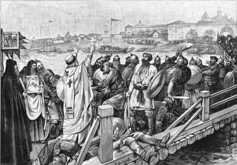 Архиепископ Новгородский Симеон унимает битву между Софийскою и Торговою сторонами на Волховском мосту в Новгороде.