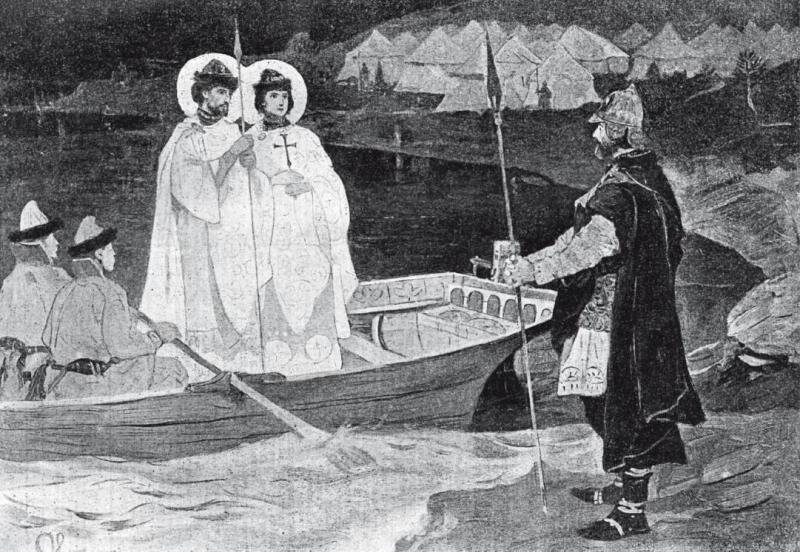 Видение воина Пелгусия. Свв. Борис и Глеб являются ночному стражу Александра Невского.